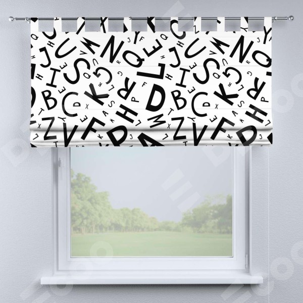 Римская штора производителя «Cortin», используется для проёма, пошита из ткани блэкаут с нанесением сублимационной печати «Литеры на белом». Данная модель пошита на петлях, комплектуется на выбор круглым карнизом и подходит для монтажа на стену. Римская штора на петлях имеет простую систему регулировки высоты, отличительным преимуществом данной модели является простой способ монтажа. Достаточно повесить ее на трубу и штора готова!