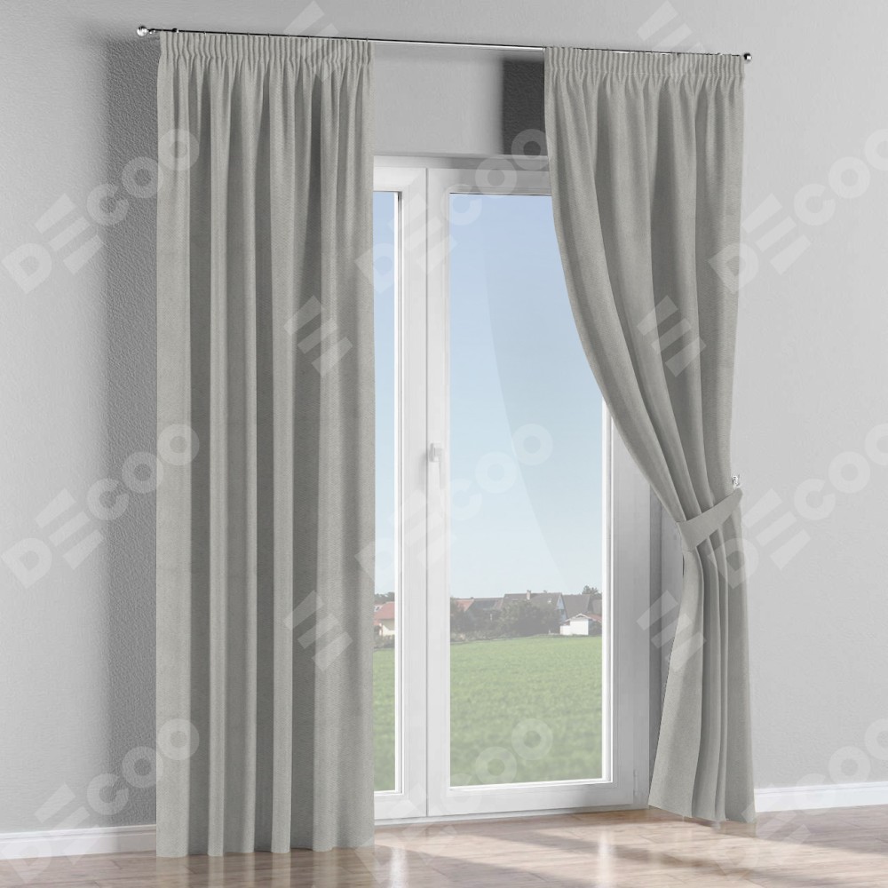 Комплект прямых штор, от производителя «Cortin», пошиты из ткани блэкаут с блеском темно-серый, артикул ткани 34634. С изнаночной стороны в верхней части штор пристрачивается шторная лента с декоративными складками «Карандаш». Обратная сторона основного материала черного цвета, что обеспечивает необходимую светонепроницаемость. Для создания элегантных складок прямые шторы шьются по стандарту с коэффициентом 1:2 (на 100 см. ширины проёма 200 см. ширины ткани).