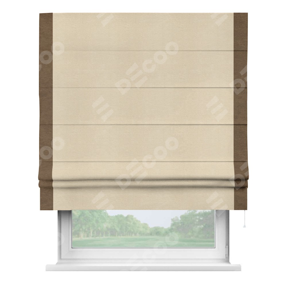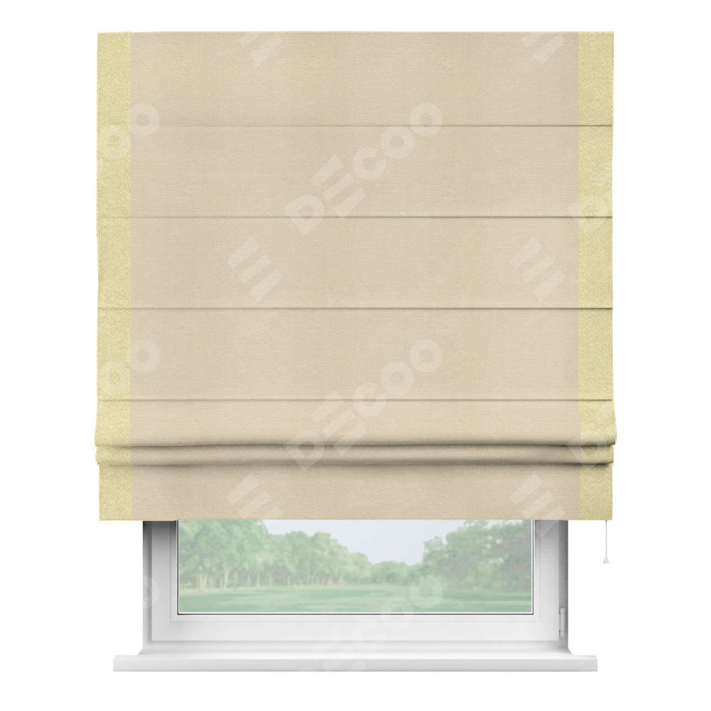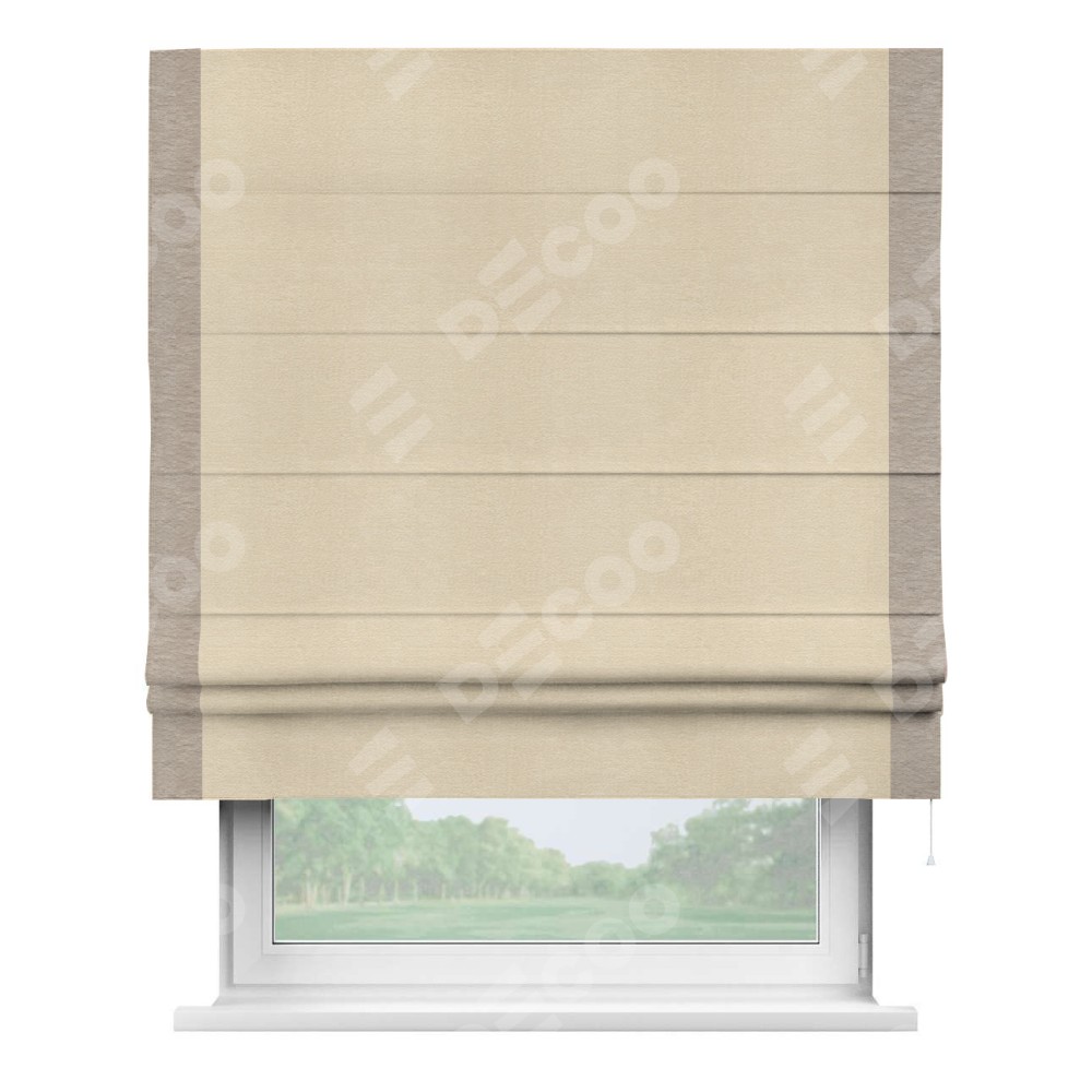 Римская штора производителя «Cortin», используется для проёма, пошита из ткани софт однотонный бежевый лайт, артикул 33100. Отделка шторы кантом «Стрим Дуо», ткань для канта используется из софта разной расцветки на выбор. Имеет универсальный механизм и подходит для монтажа: на потолок, на стену и в нишу.