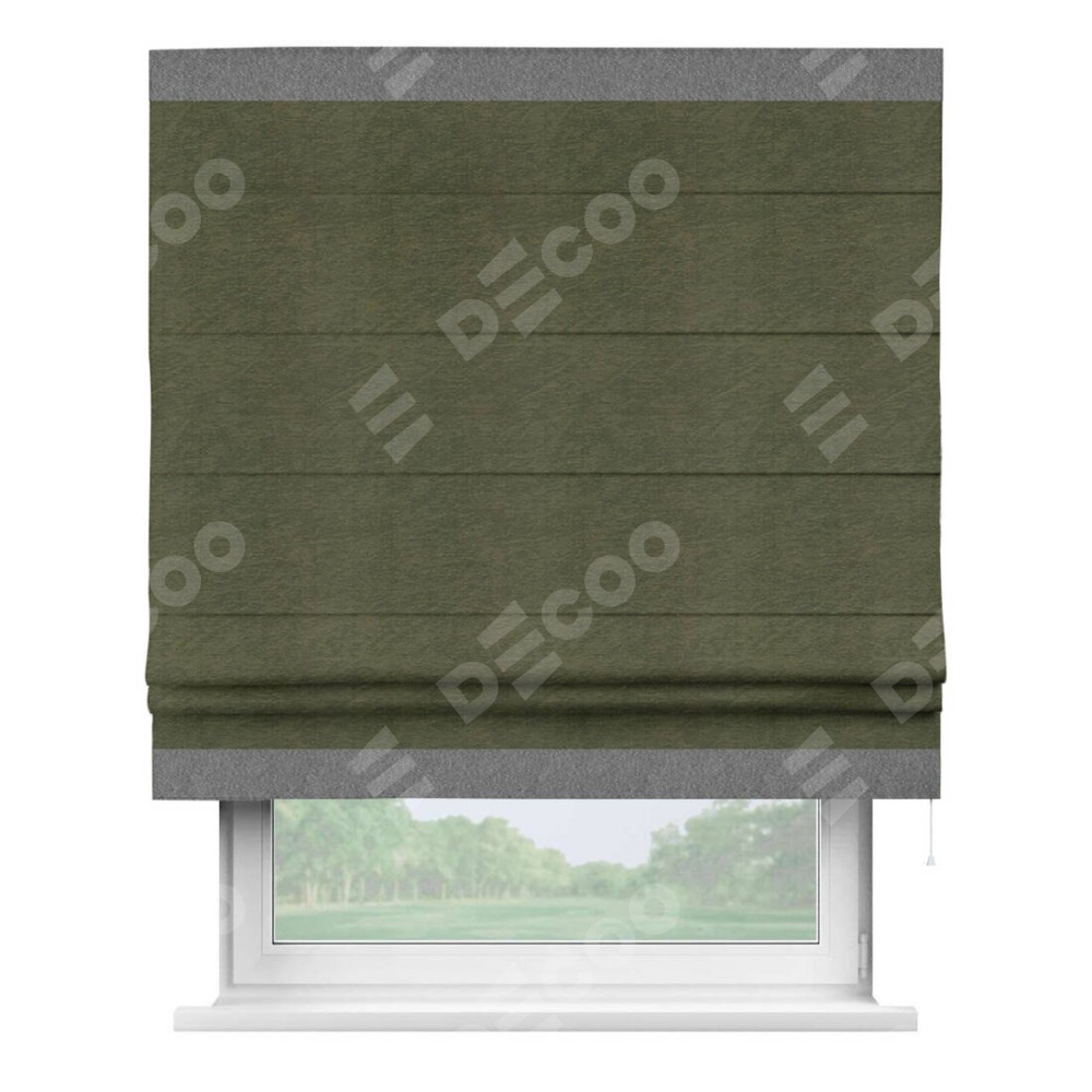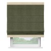 Римская штора производителя «Cortin», используется для проёма, пошита из ткани софт однотонный зелёный, артикул 33110. Отделка шторы кантом «Горизонт», ткань для канта используется из софта разной расцветки на выбор. Имеет универсальный механизм и подходит для монтажа: на потолок, на стену и в нишу.