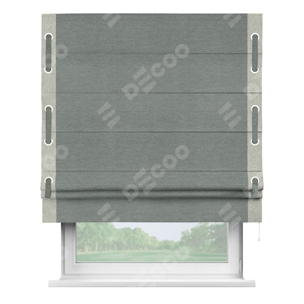 Римская штора производителя «Cortin», используется для проёма, пошита из ткани твид блэкаут серый, артикул 21577. Отделка шторы кантом «Стрим Дуо» на кантах расположены люверсы с пояском, ткань для канта используется из твида разной расцветки на выбор. Ткань для пояска обычно используется из основной ткани шторы, а так же можно сделать из любой расцветки по желанию. Имеет универсальный механизм и подходит для монтажа: на потолок, на стену и в нишу.