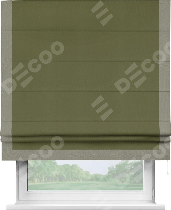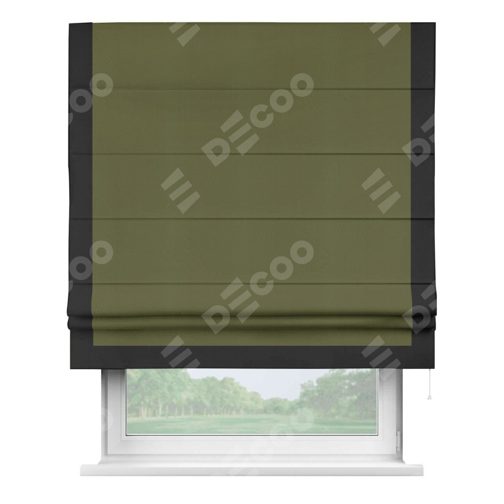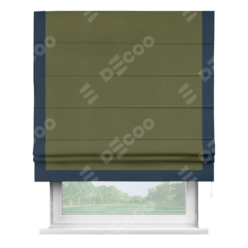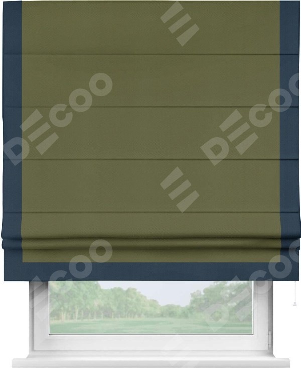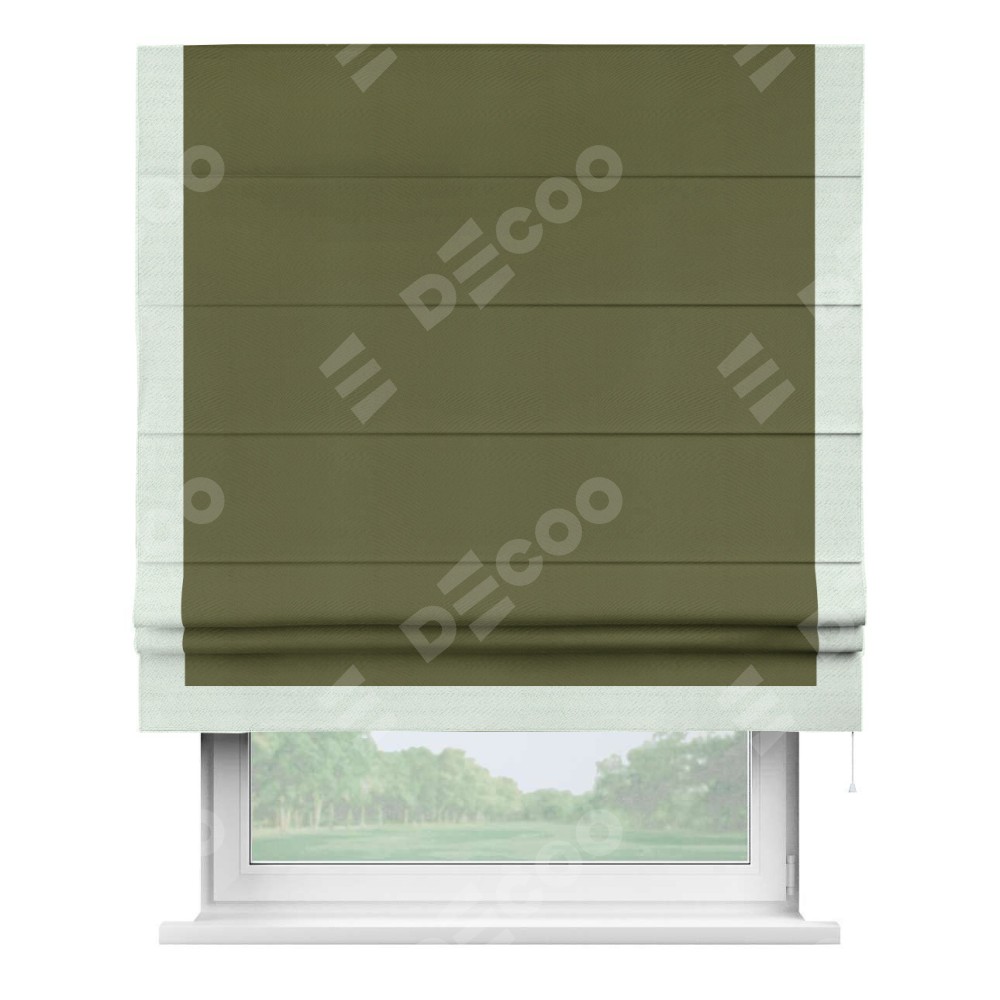 Римская штора производителя «Cortin», используется для проёма, пошита из ткани блэкаут однотонный зелёный, артикул ткани 81859. Отделка шторы кантом «Виктория», ткань для канта используется из блэкаута однотонного разной расцветки на выбор. Имеет универсальный механизм и подходит для монтажа: на потолок, на стену и в нишу.