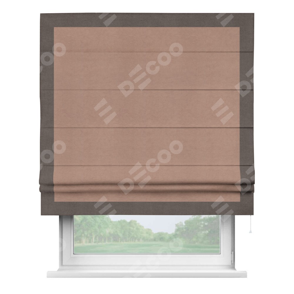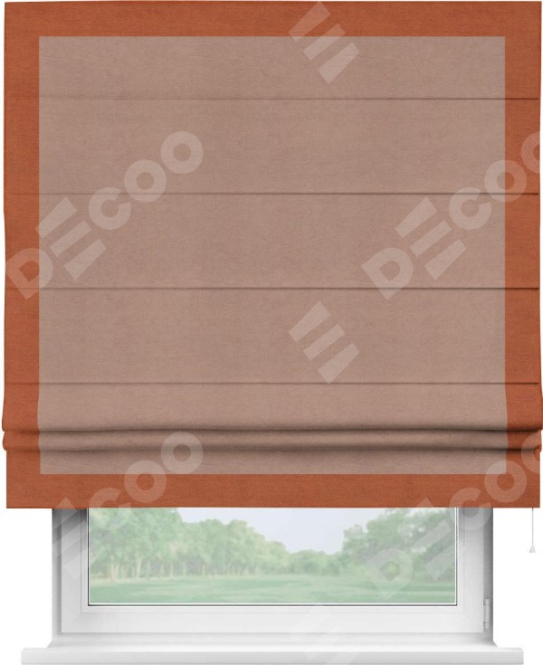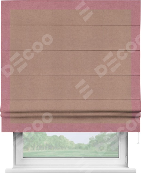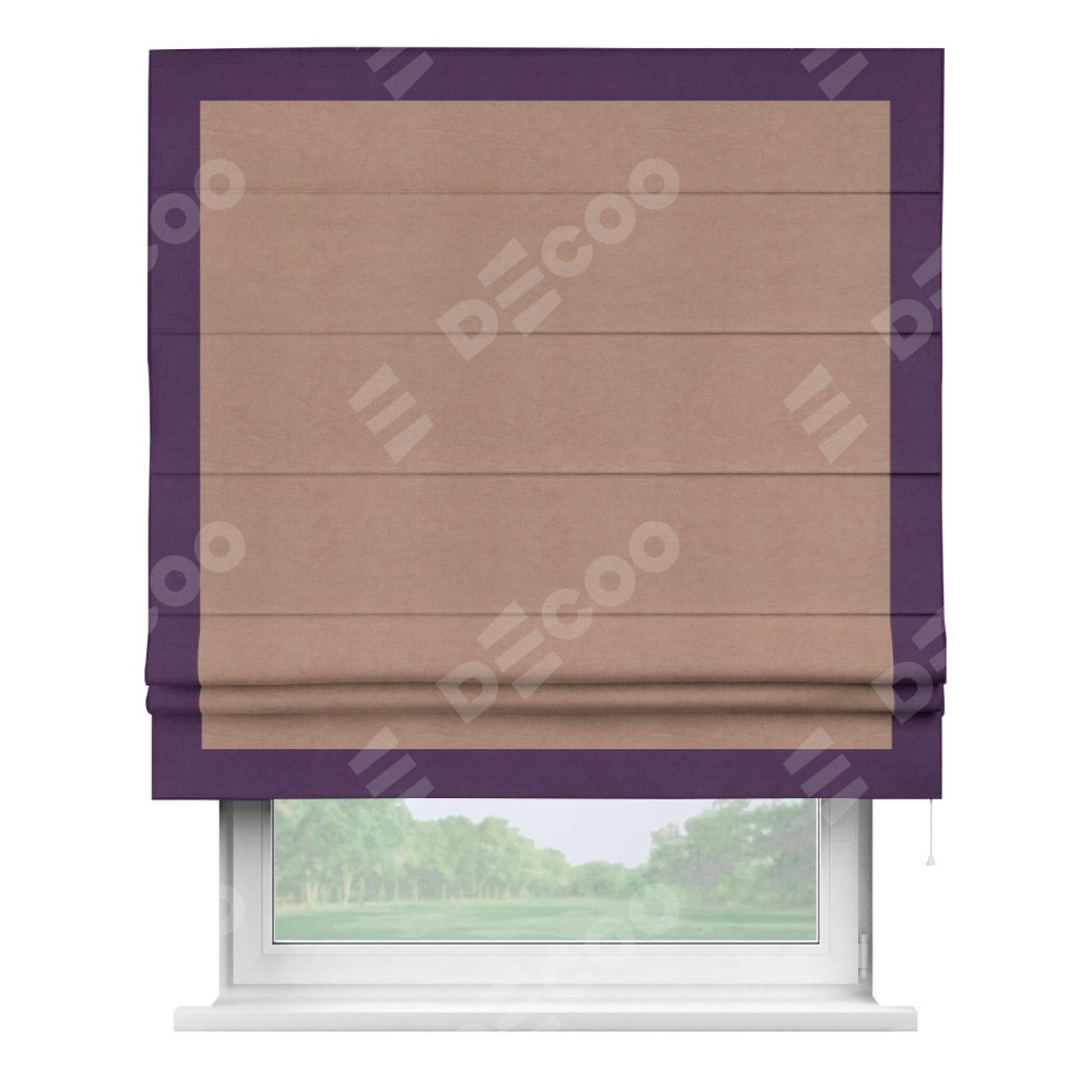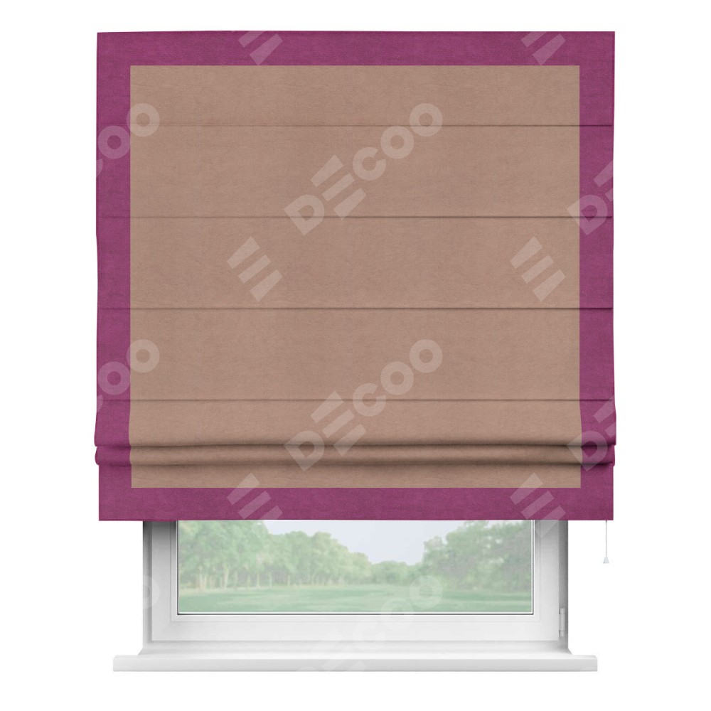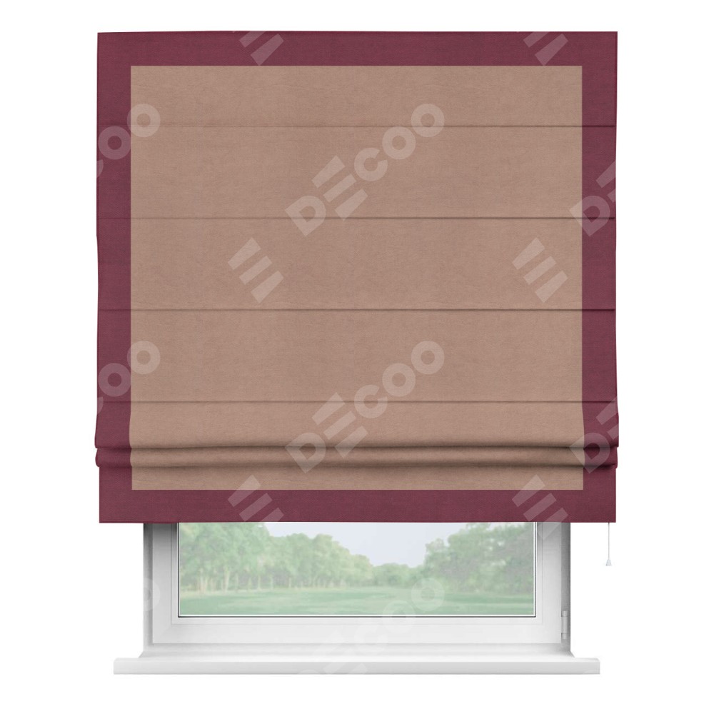 Римская штора производителя «Cortin», используется для проёма, пошита из ткани вельвет брусничный джем, артикул ткани 17750. Отделка шторы кантом «Чесс», ткань для канта используется из вельвета разной расцветки на выбор. Имеет универсальный механизм и подходит для монтажа: на потолок, на стену и в нишу.