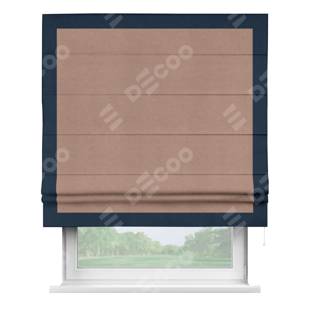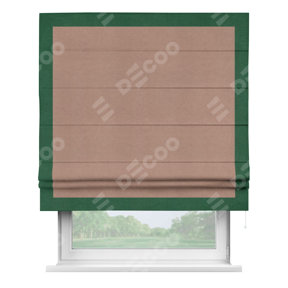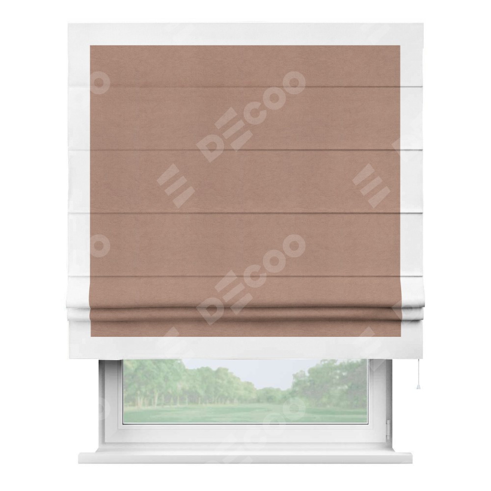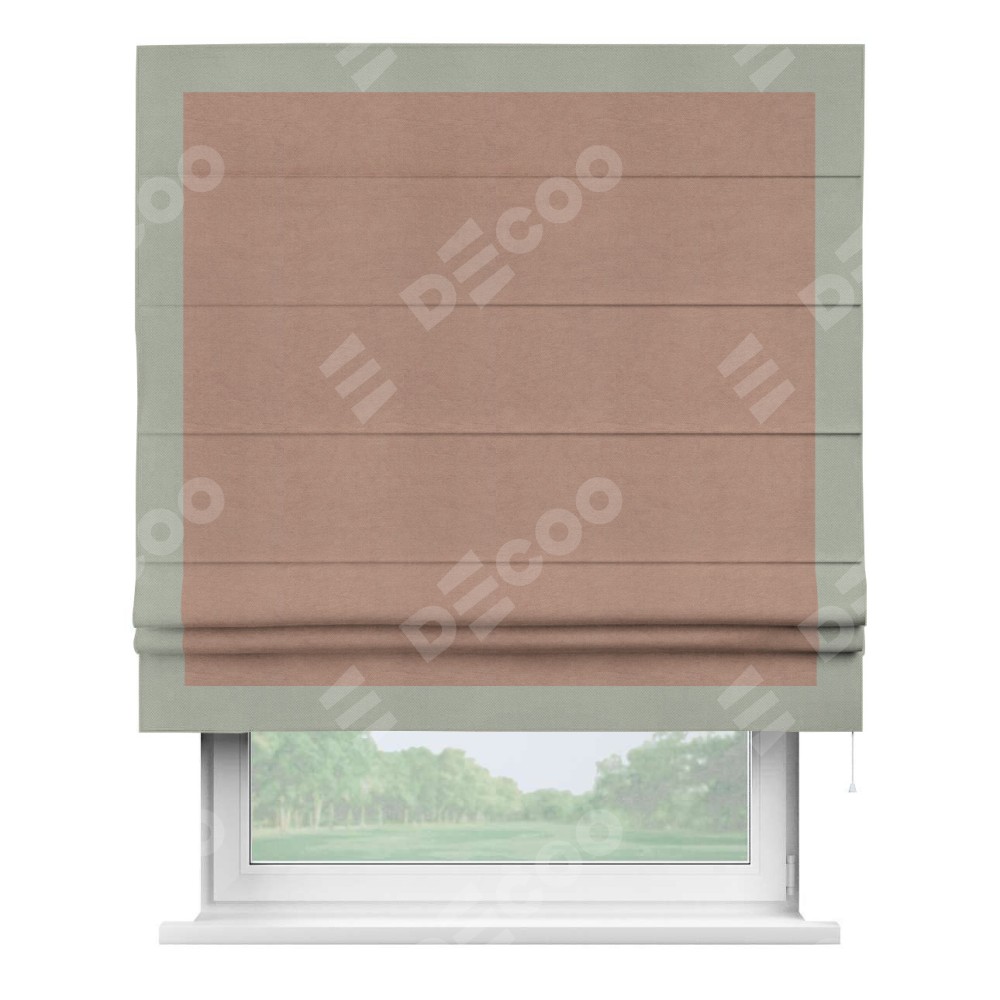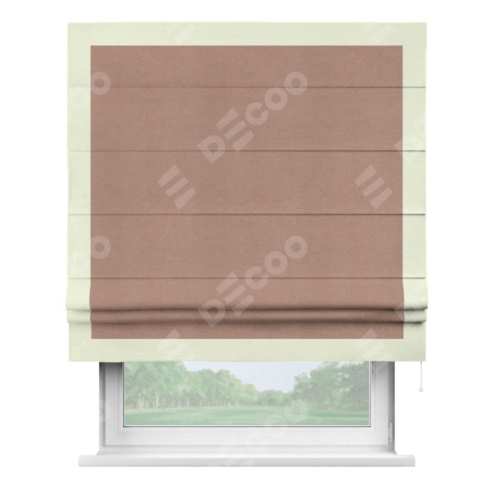 Римская штора производителя «Cortin», используется для проёма, пошита из ткани вельвет брусничный джем, артикул ткани 17750. Отделка шторы кантом «Чесс», ткань для канта используется из вельвета разной расцветки на выбор. Имеет универсальный механизм и подходит для монтажа: на потолок, на стену и в нишу.