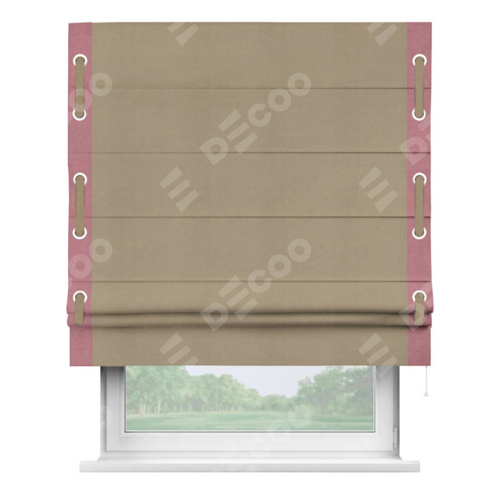 Римская штора производителя «Cortin», используется для проёма, пошита из ткани вельвет кофейный, артикул ткани 30980. Отделка шторы кантом «Стрим Дуо» на кантах расположены люверсы с пояском, ткань для канта используется из вельвета разной расцветки на выбор. Ткань для пояска обычно используется из основной ткани шторы, а так же можно сделать из любой расцветки по желанию. Имеет универсальный механизм и подходит для монтажа: на потолок, на стену и в нишу.