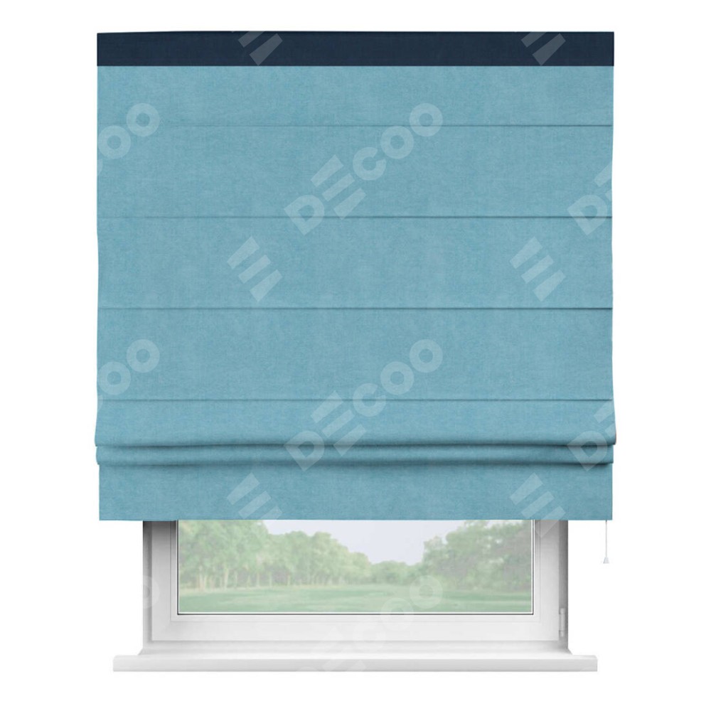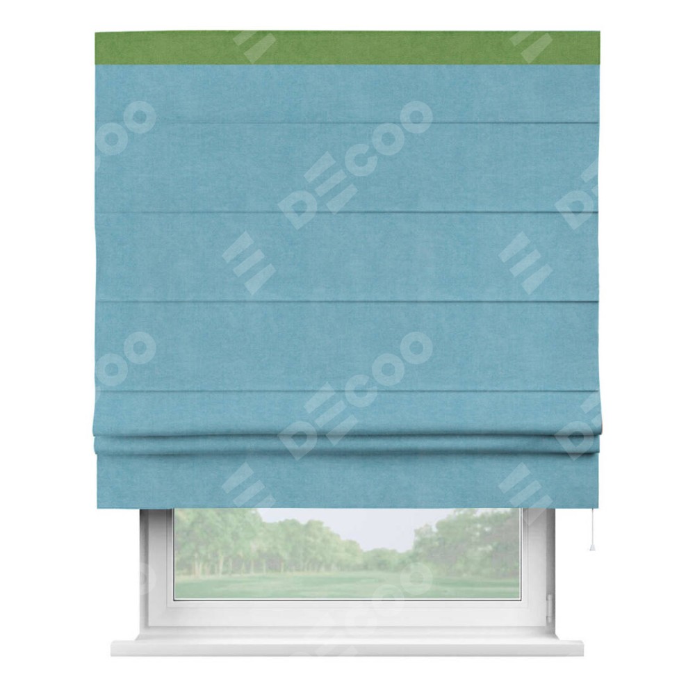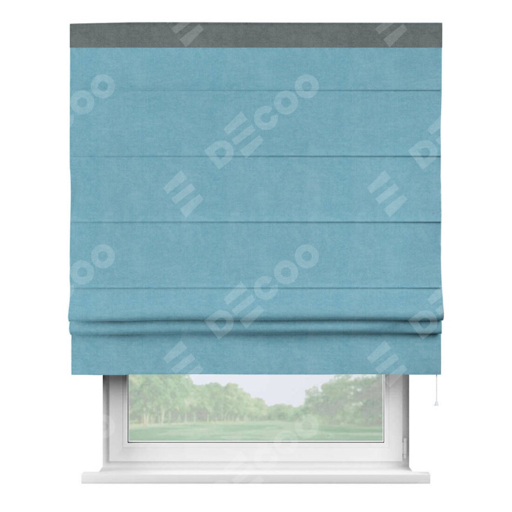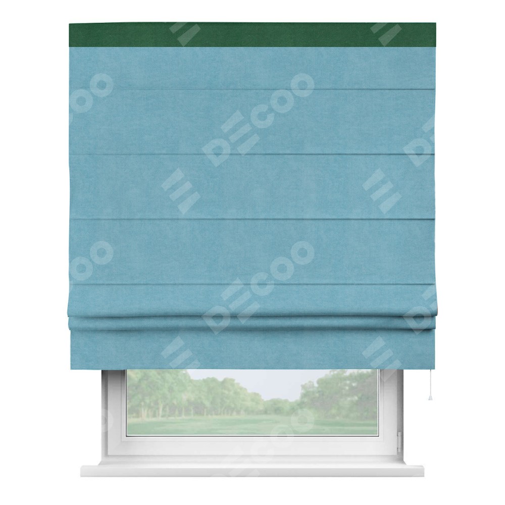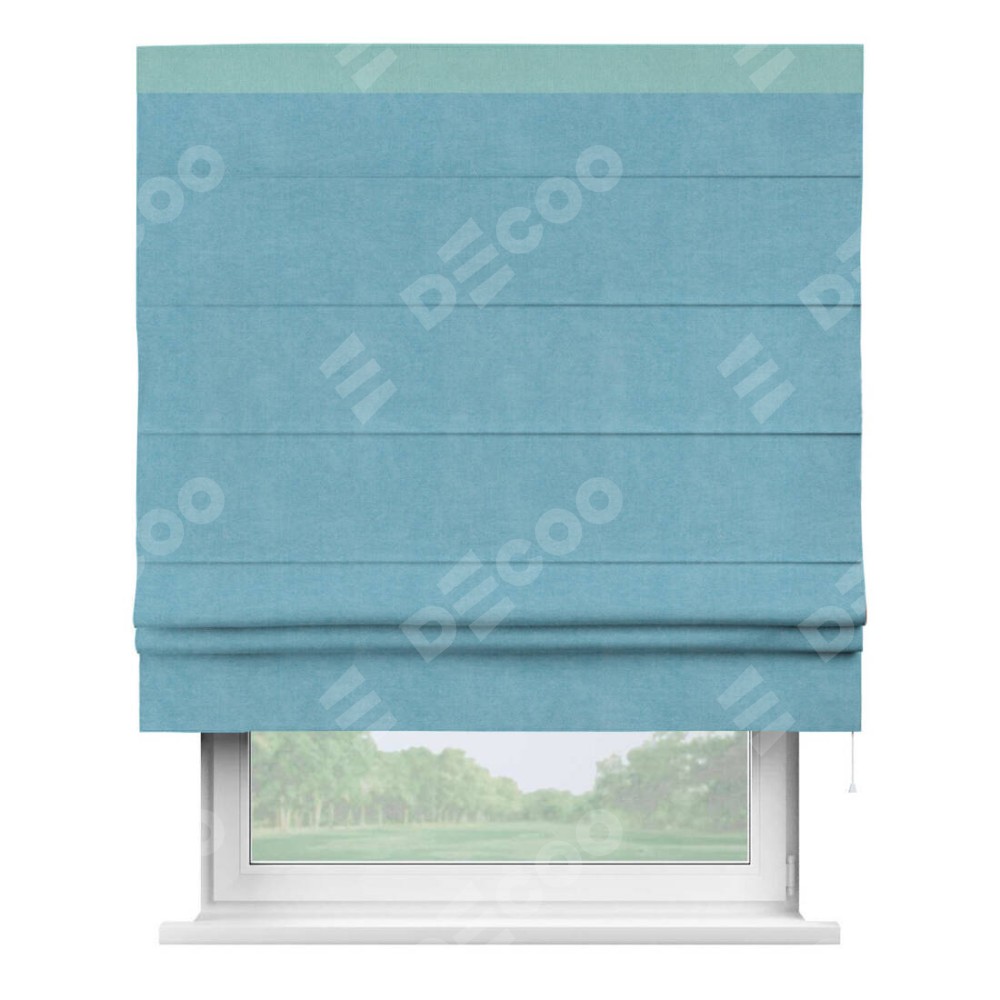 Римская штора производителя «Cortin», используется для проёма, пошита из ткани вельвет ментоловый, артикул ткани 10443. Отделка шторы кантом «Кинг», ткань для канта используется из вельвета разной расцветки на выбор. Имеет универсальный механизм и подходит для монтажа: на потолок, на стену и в нишу.