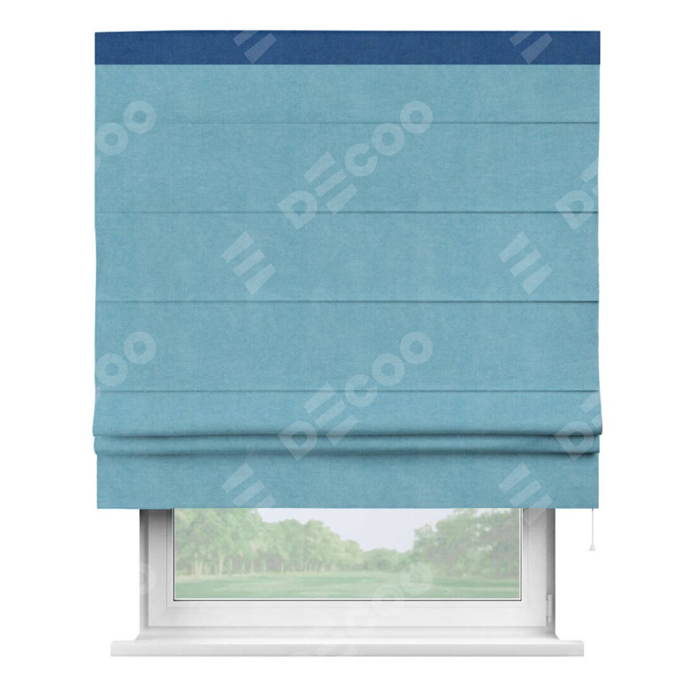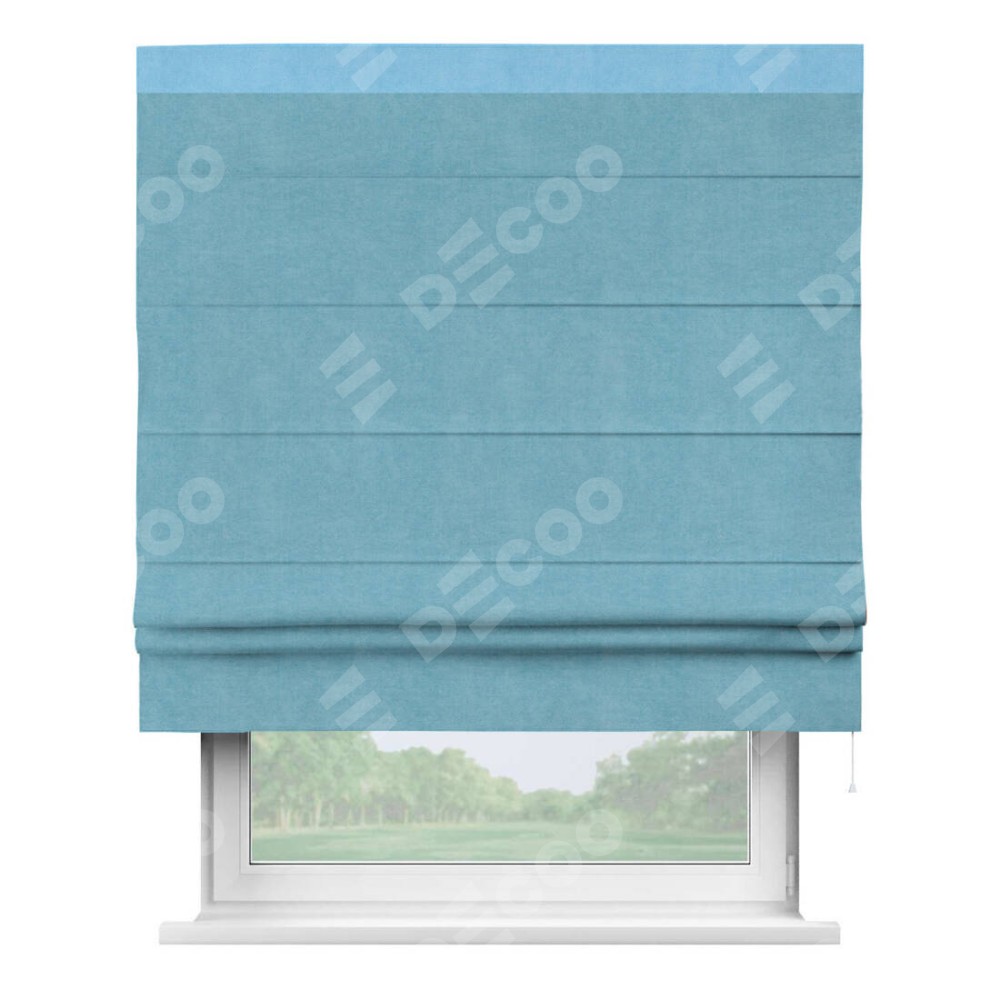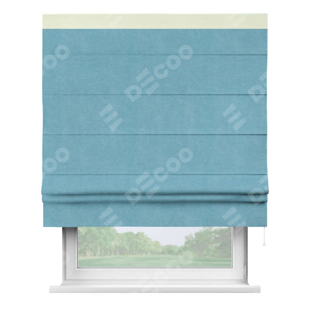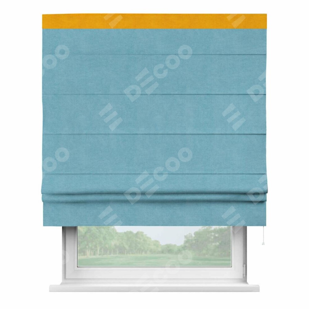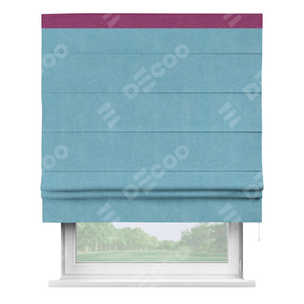 Римская штора производителя «Cortin», используется для проёма, пошита из ткани вельвет ментоловый, артикул ткани 10443. Отделка шторы кантом «Кинг», ткань для канта используется из вельвета разной расцветки на выбор. Имеет универсальный механизм и подходит для монтажа: на потолок, на стену и в нишу.