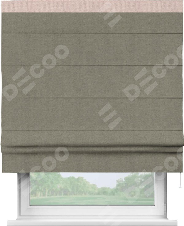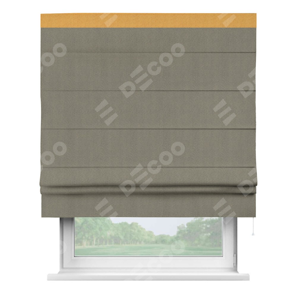 Римская штора производителя «Cortin», используется для проёма, пошита из ткани блэкаут с блеском графитовый, артикул 34648. Отделка шторы кантом «Кинг», ткань для канта используется из блэкаута с блеском разной расцветки на выбор. Изнаночная сторона материала черного цвета, что обеспечивает необходимую светонепроницаемость. Имеет универсальный механизм и подходит для монтажа: на потолок, на стену и в нишу.