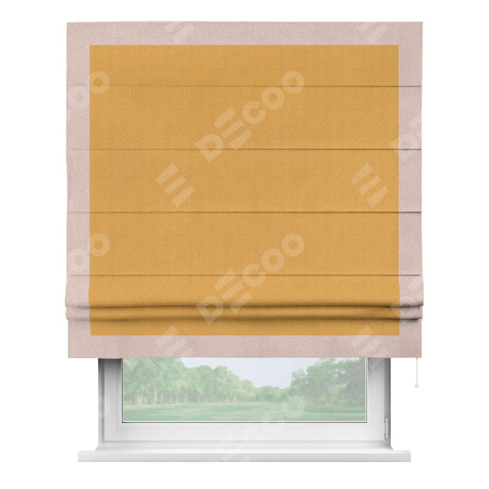 Римская штора производителя «Cortin», используется для проёма, пошита из ткани блэкаут с блеском золотой, артикул 34626. Отделка шторы кантом «Чесс», ткань для канта используется из блэкаута с блеском разной расцветки на выбор. Изнаночная сторона материала черного цвета, что обеспечивает необходимую светонепроницаемость. Имеет универсальный механизм и подходит для монтажа: на потолок, на стену и в нишу.