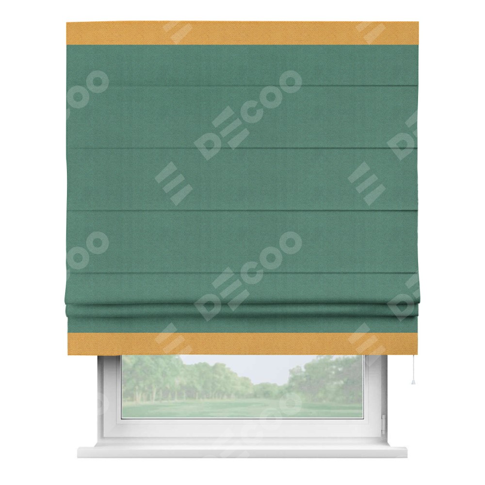 Римская штора производителя «Cortin», используется для проёма, пошита из ткани блэкаут с блеском изумрудный, артикул 34628. Отделка шторы кантом «Горизонт», ткань для канта используется из блэкаута с блеском разной расцветки на выбор. Изнаночная сторона материала черного цвета, что обеспечивает необходимую светонепроницаемость. Имеет универсальный механизм и подходит для монтажа: на потолок, на стену и в нишу.