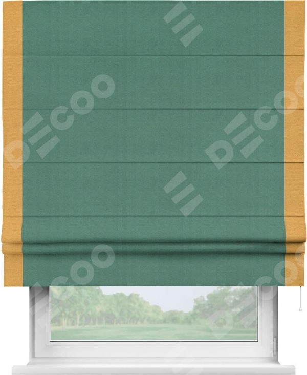 Римская штора производителя «Cortin», используется для проёма, пошита из ткани блэкаут с блеском изумрудный, артикул 34628. Отделка шторы кантом «Стрим Дуо», ткань для канта используется из блэкаута с блеском разной расцветки на выбор. Изнаночная сторона материала черного цвета, что обеспечивает необходимую светонепроницаемость. Имеет универсальный механизм и подходит для монтажа: на потолок, на стену и в нишу.