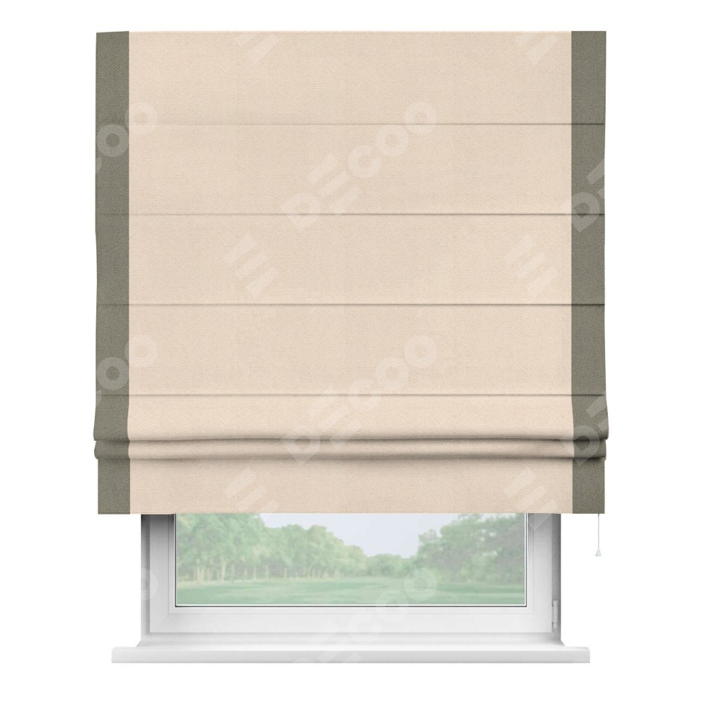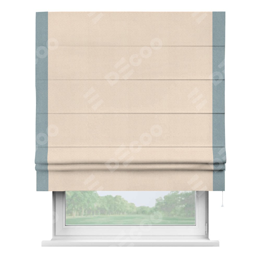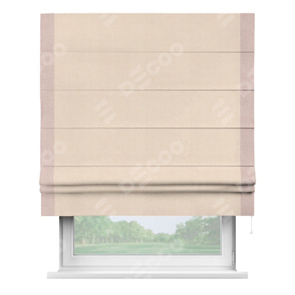 Римская штора производителя «Cortin», используется для проёма, пошита из ткани блэкаут с блеском розовая пудра, артикул 34632. Отделка шторы кантом «Стрим Дуо», ткань для канта используется из блэкаута с блеском разной расцветки на выбор. Изнаночная сторона материала черного цвета, что обеспечивает необходимую светонепроницаемость. Имеет универсальный механизм и подходит для монтажа: на потолок, на стену и в нишу.