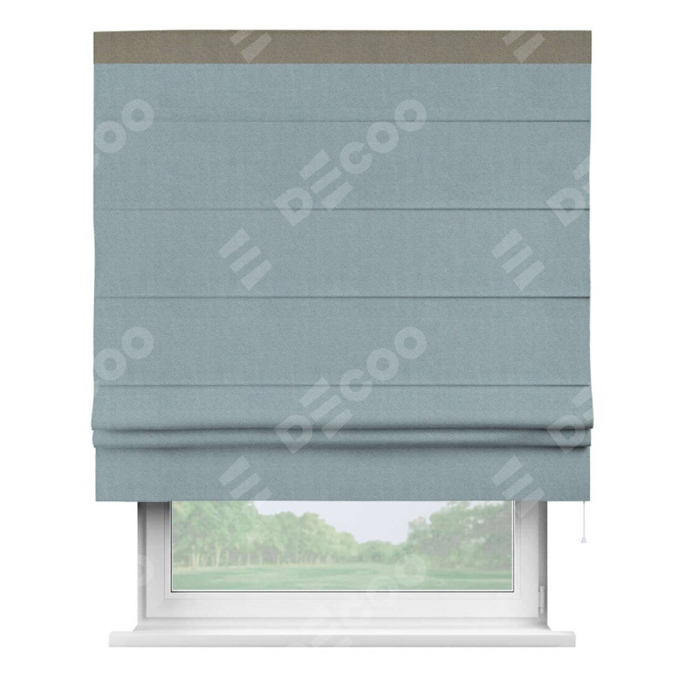 Римская штора производителя «Cortin», используется для проёма, пошита из ткани блэкаут с блеском синий, артикул 34625. Отделка шторы кантом «Кинг», ткань для канта используется из блэкаута с блеском разной расцветки на выбор. Изнаночная сторона материала черного цвета, что обеспечивает необходимую светонепроницаемость. Имеет универсальный механизм и подходит для монтажа: на потолок, на стену и в нишу.