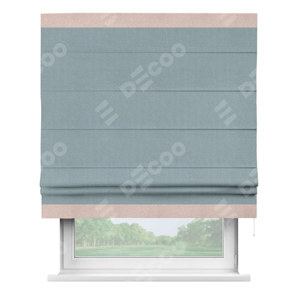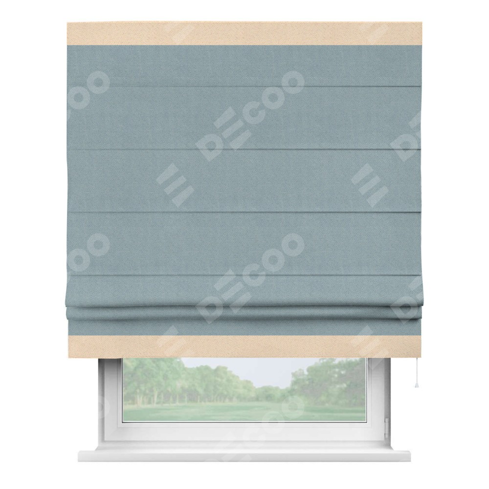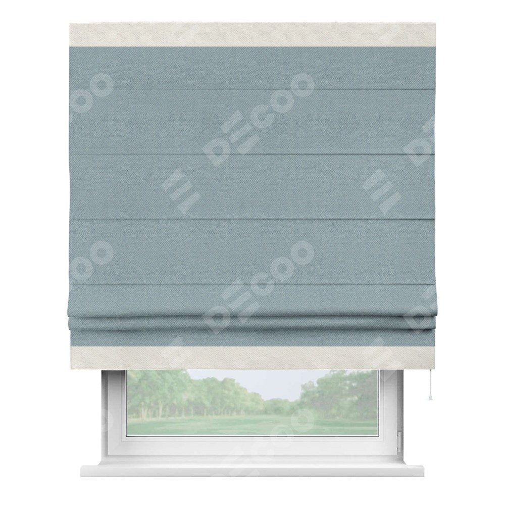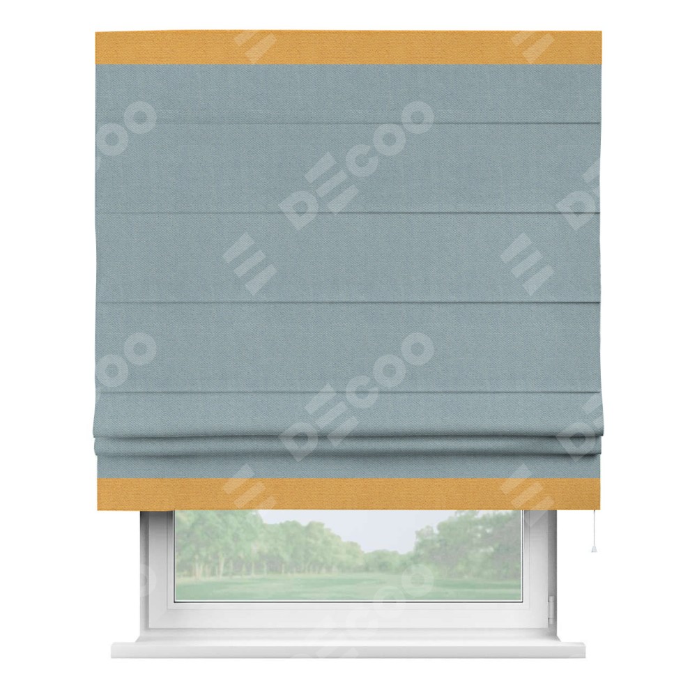 Римская штора производителя «Cortin», используется для проёма, пошита из ткани блэкаут с блеском синий, артикул 34625. Отделка шторы кантом «Горизонт», ткань для канта используется из блэкаута с блеском разной расцветки на выбор. Изнаночная сторона материала черного цвета, что обеспечивает необходимую светонепроницаемость. Имеет универсальный механизм и подходит для монтажа: на потолок, на стену и в нишу.