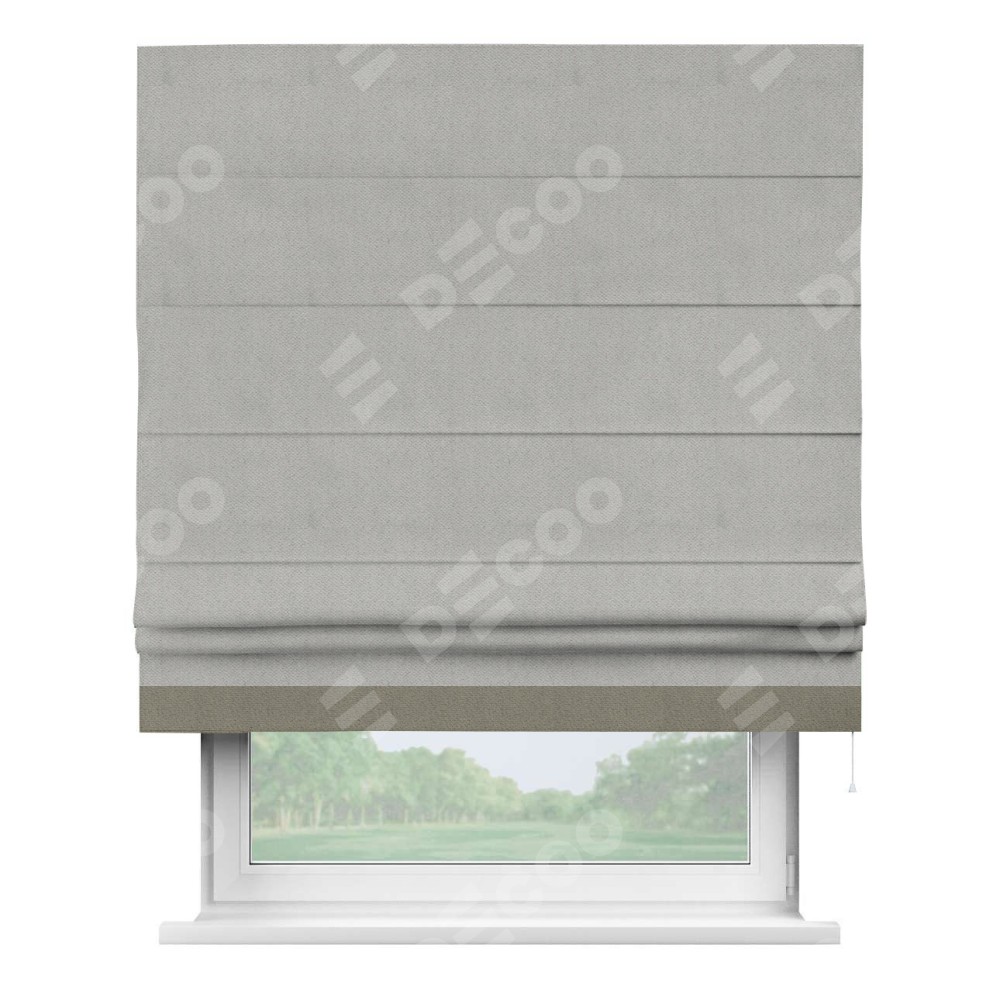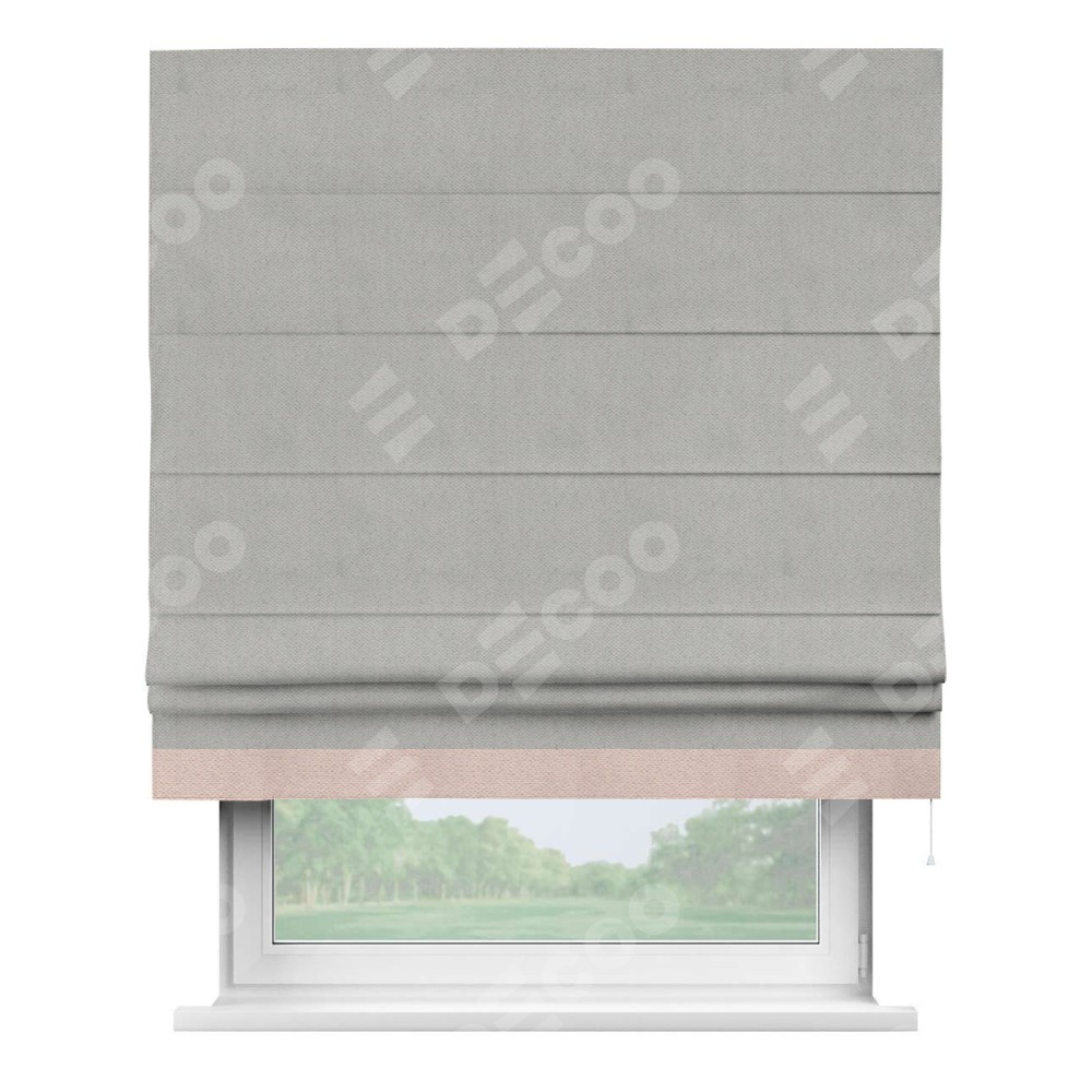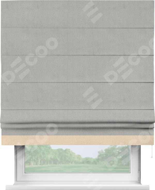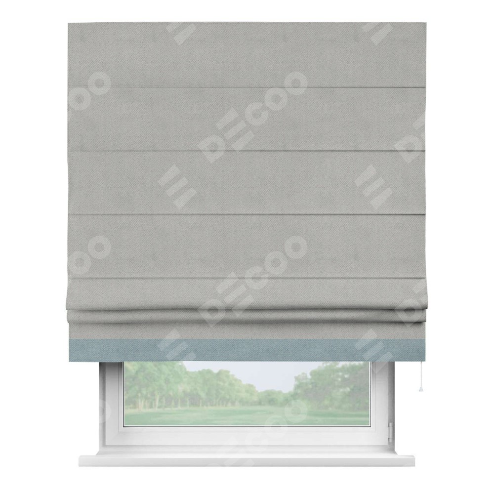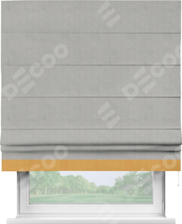 Римская штора производителя «Cortin», используется для проёма, пошита из ткани блэкаут с блеском тёмно-серый, артикул 34634. Отделка шторы кантом «Джестер», ткань для канта используется из блэкаута с блеском разной расцветки на выбор. Изнаночная сторона материала черного цвета, что обеспечивает необходимую светонепроницаемость. Имеет универсальный механизм и подходит для монтажа: на потолок, на стену и в нишу.