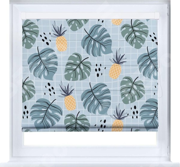 Римская штора производителя «Cortin», устанавливается на створку окна, пошита из ткани блэкаут с нанесением сублимационной печати «Ананасы и листья монстеры». Штора шьётся по индивидуальным размерам, для данного типа римской шторы возможная ширина от 35 до 150 см., высота до 250 см.