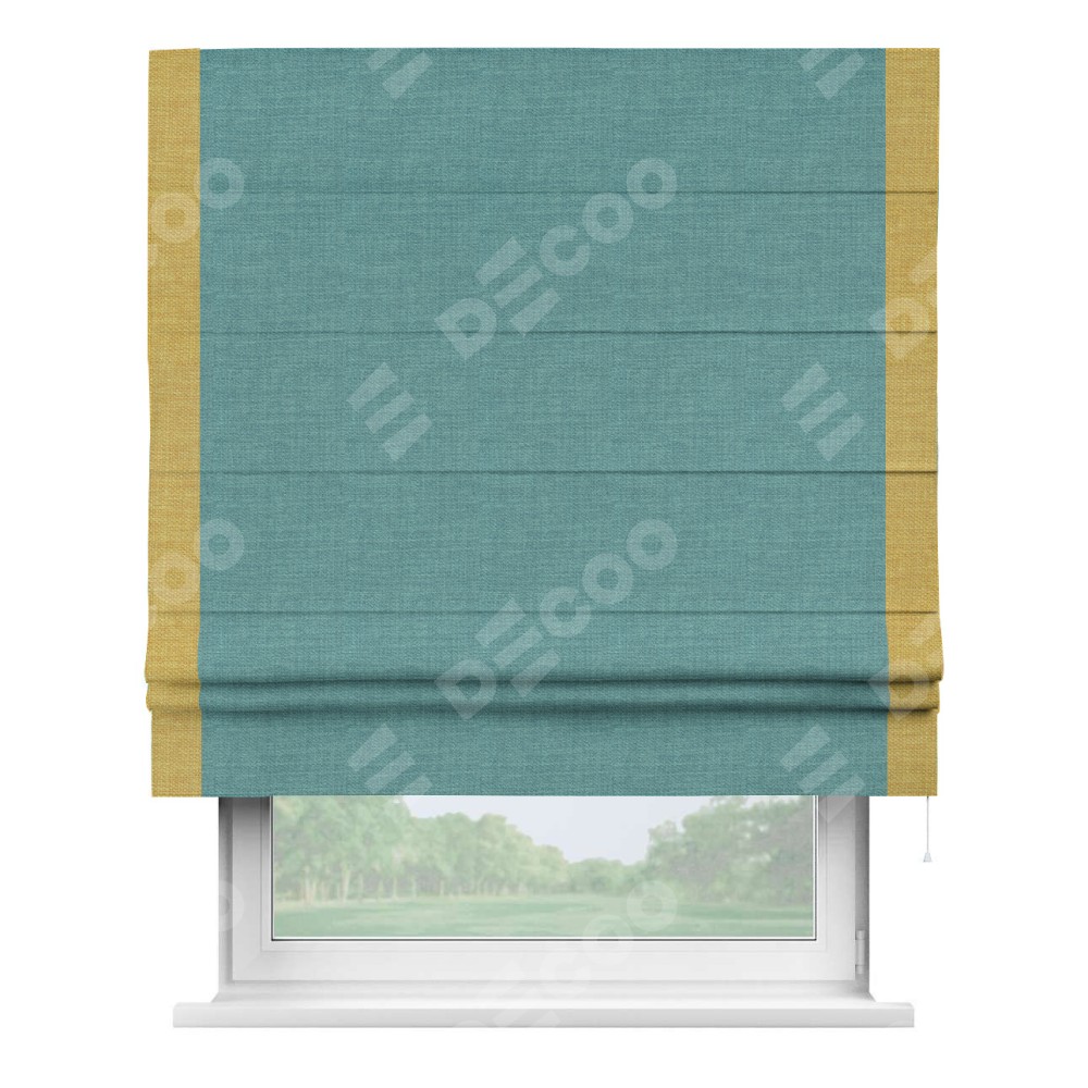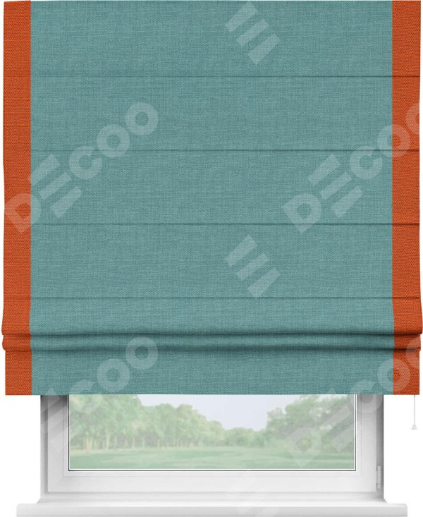 Римская штора производителя «Cortin», используется для проёма, пошита из ткани лён бирюза, артикул 7446. Отделка шторы кантом «Стрим Дуо», ткань для канта используется из льна разной расцветки на выбор. Имеет универсальный механизм и подходит для монтажа: на потолок, на стену и в нишу.