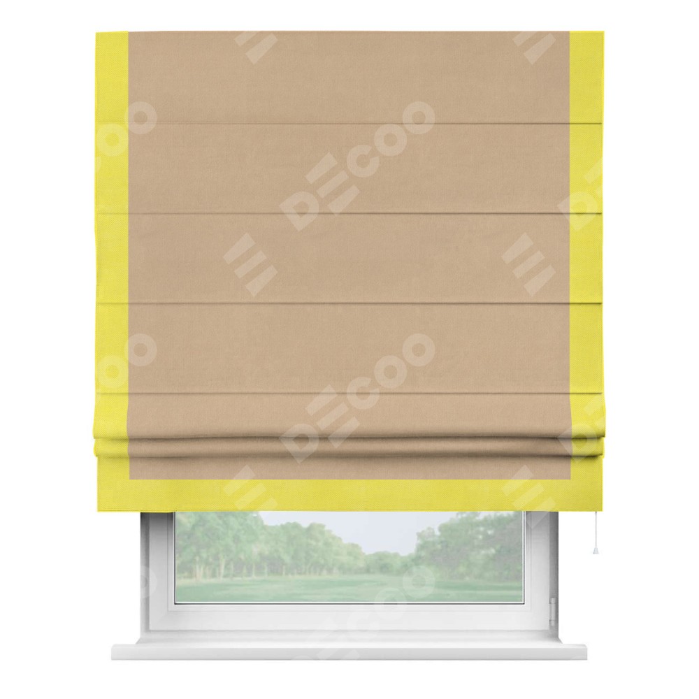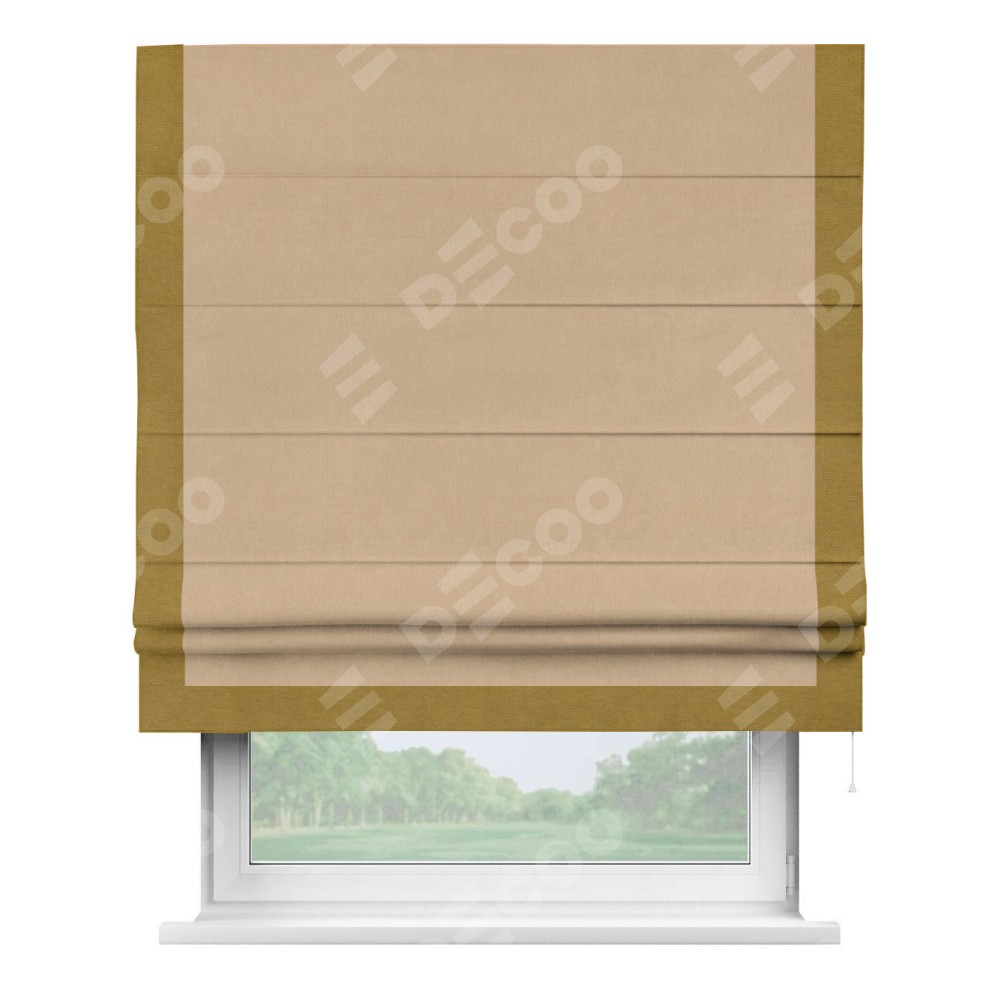 Римская штора производителя «Cortin», используется для проёма, пошита из ткани вельвет песочный, артикул ткани 17740. Отделка шторы кантом «Виктория», ткань для канта используется из вельвета разной расцветки на выбор. Имеет универсальный механизм и подходит для монтажа: на потолок, на стену и в нишу.