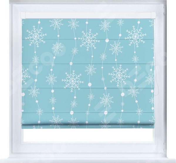 Римская штора производителя «Cortin», устанавливается на створку окна, пошита из ткани блэкаут с нанесением сублимационной печати «Гирлянда из снежинок». Штора шьётся по индивидуальным размерам, для данного типа римской шторы возможная ширина от 35 до 150 см., высота до 250 см.