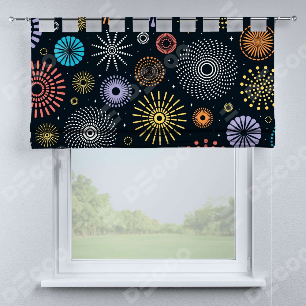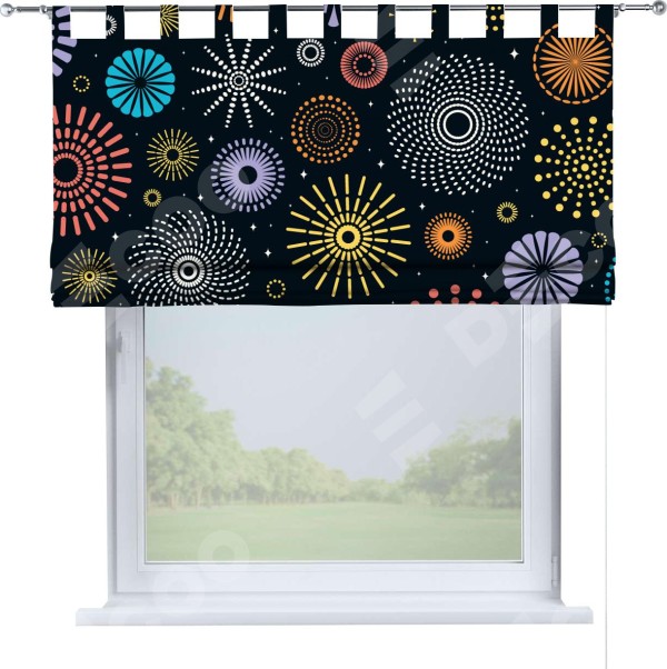 Римская штора производителя «Cortin», используется для проёма, пошита из ткани блэкаут с нанесением сублимационной печати «Праздничный фейерверк». Данная модель пошита на петлях, комплектуется на выбор круглым карнизом и подходит для монтажа на стену. Римская штора на петлях имеет простую систему регулировки высоты, отличительным преимуществом данной модели является простой способ монтажа. Достаточно повесить ее на трубу и штора готова!