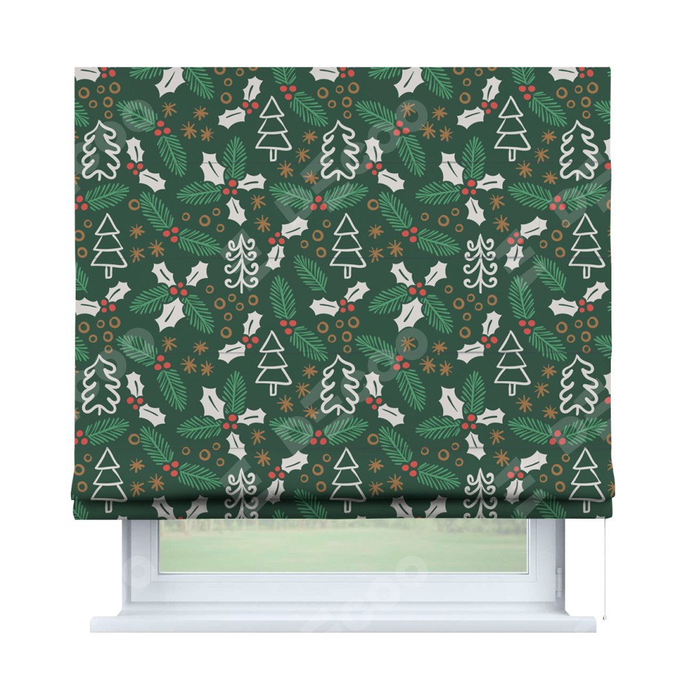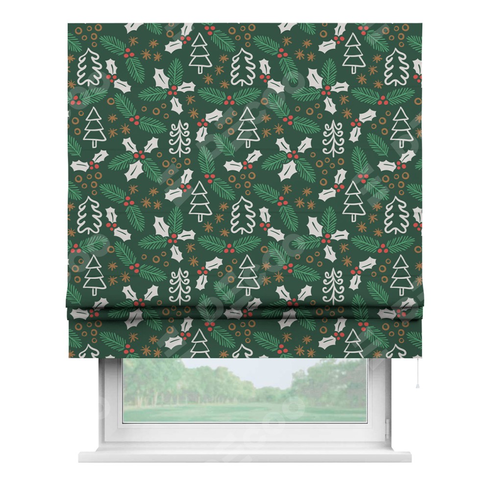 Римская штора производителя «Cortin», используется для проёма, пошита из ткани блэкаут с нанесением сублимационной печати «Рождественский узор». Имеет универсальный механизм и подходит для монтажа: на потолок, на стену и в нишу.