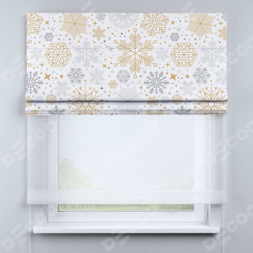 Римская штора день-ночь производителя «Cortin», используется для проёма, пошита из двух полотен, с лицевой блэкаут с нанесением сублимационной печати «Снежное очарование», вторая ткань тюль (по стандарту комплектуется тюль белого цвета артикул V-01). Имеет универсальный механизм и подходит для монтажа: на потолок, на стену и в нишу.