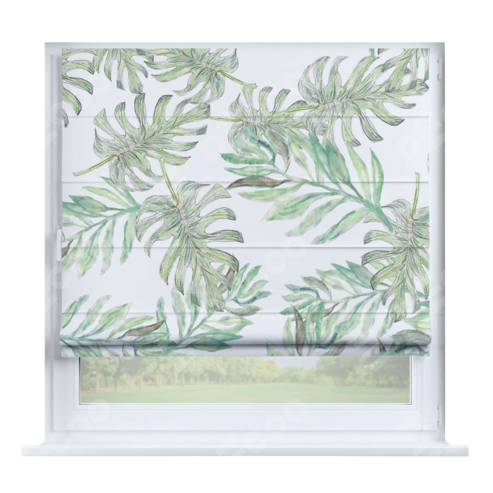 Римская штора производителя «Cortin», устанавливается на створку окна, пошита из ткани блэкаут с нанесением сублимационной печати «Листья монстеры». Штора шьётся по индивидуальным размерам, для данного типа римской шторы возможная ширина от 35 до 150 см., высота до 250 см.
