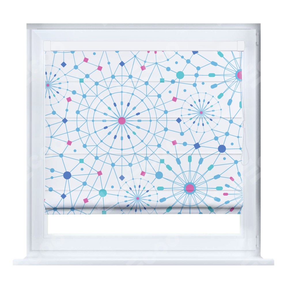Римская штора производителя «Cortin», устанавливается на створку окна, пошита из ткани блэкаут с нанесением сублимационной печати «Круги и линии». Штора шьётся по индивидуальным размерам, для данного типа римской шторы возможная ширина от 35 до 150 см., высота до 250 см.