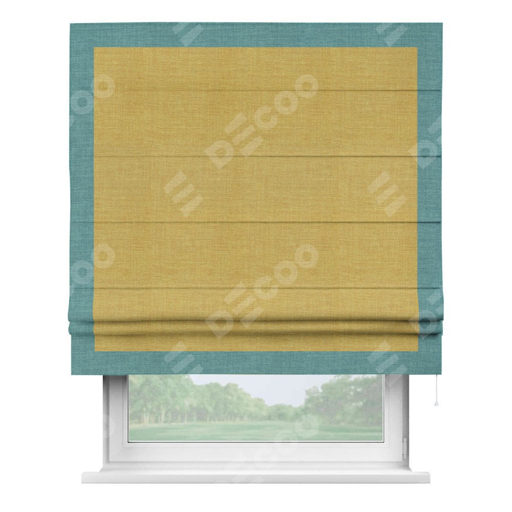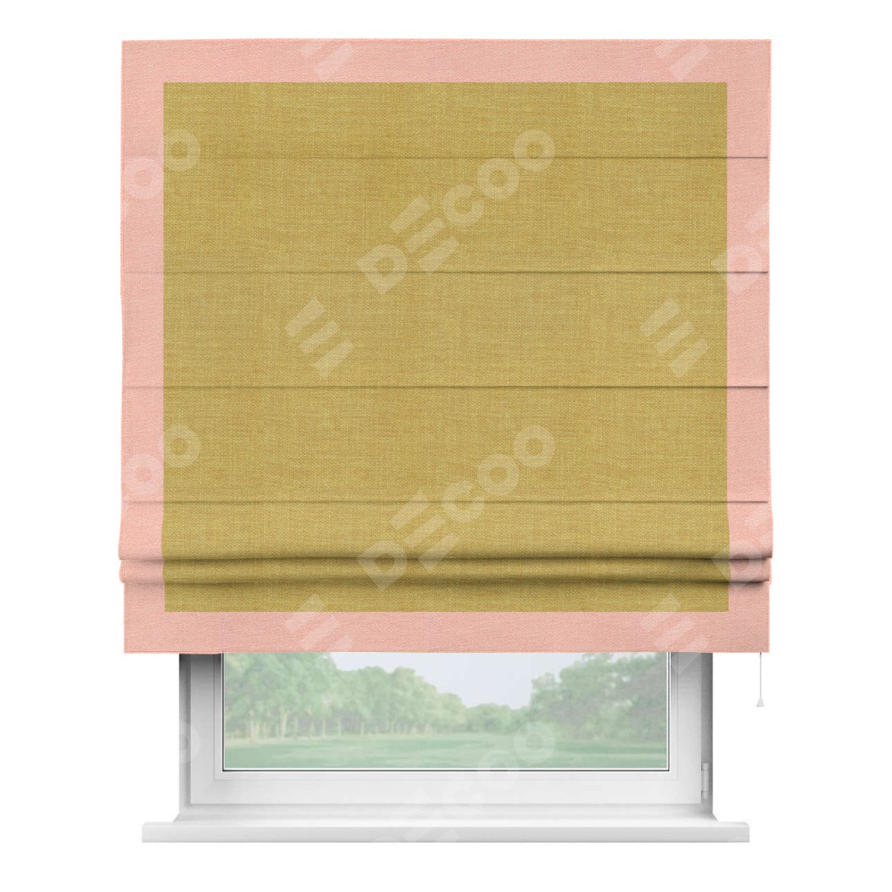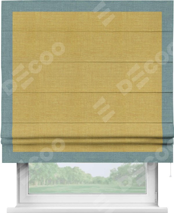 Римская штора производителя «Cortin», используется для проёма, пошита из ткани лён горчичный, артикул 74740. Отделка шторы кантом «Чесс», ткань для канта используется из льна разной расцветки на выбор. Имеет универсальный механизм и подходит для монтажа: на потолок, на стену и в нишу.