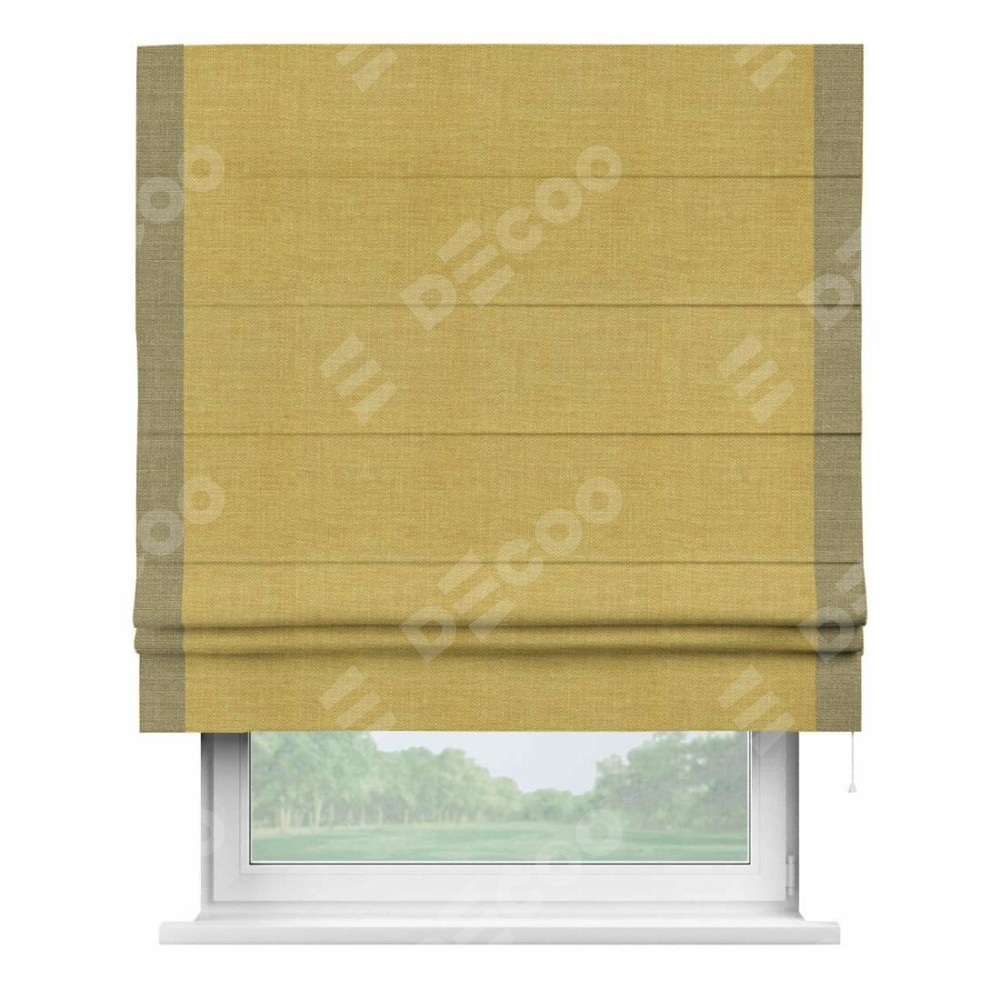 Римская штора производителя «Cortin», используется для проёма, пошита из ткани лён горчичный, артикул 74740. Отделка шторы кантом «Стрим Дуо», ткань для канта используется из льна разной расцветки на выбор. Имеет универсальный механизм и подходит для монтажа: на потолок, на стену и в нишу.
