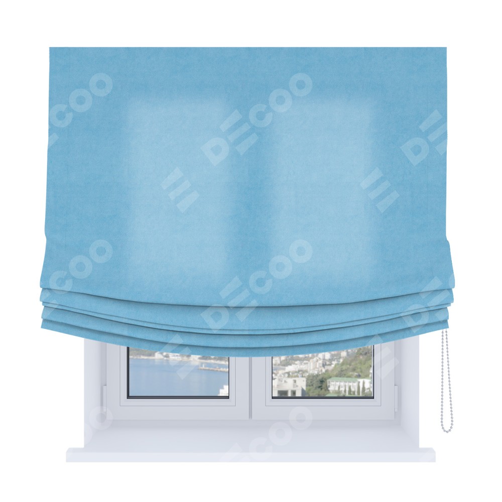 Римская штора Soft производителя «Cortin», используется для проёма, пошита из ткани вельвет голубой, артикул ткани 85544. Имеет универсальный механизм и подходит для монтажа: на потолок, на стену и в нишу. В отличие от стандартных римских штор, римская штора Soft не имеет горизонтальных вставок и нижнего отвеса. Это позволяет ткани произвольно драпироваться в свободные мягкие складки.