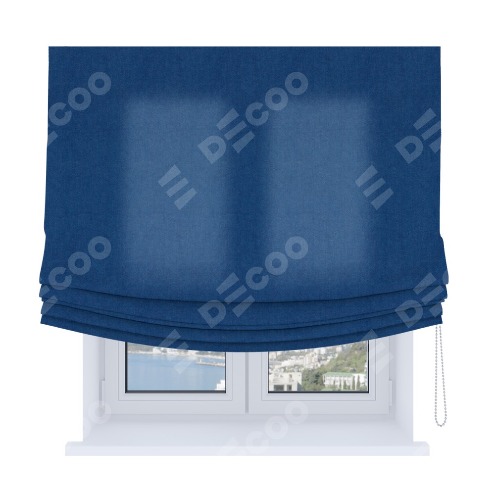 Римская штора Soft производителя «Cortin», используется для проёма, пошита из ткани вельвет синий, артикул ткани 85554. Имеет универсальный механизм и подходит для монтажа: на потолок, на стену и в нишу. В отличие от стандартных римских штор, римская штора Soft не имеет горизонтальных вставок и нижнего отвеса. Это позволяет ткани произвольно драпироваться в свободные мягкие складки.