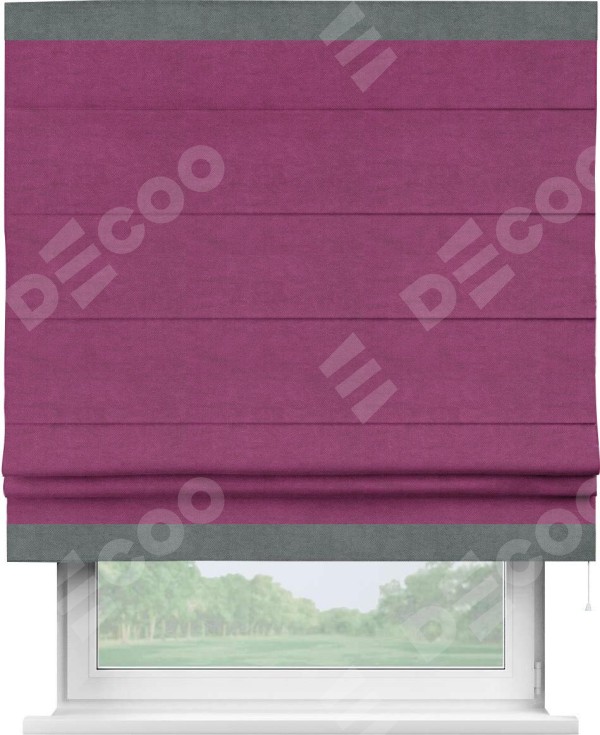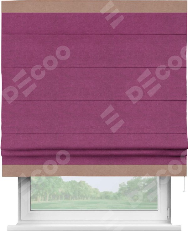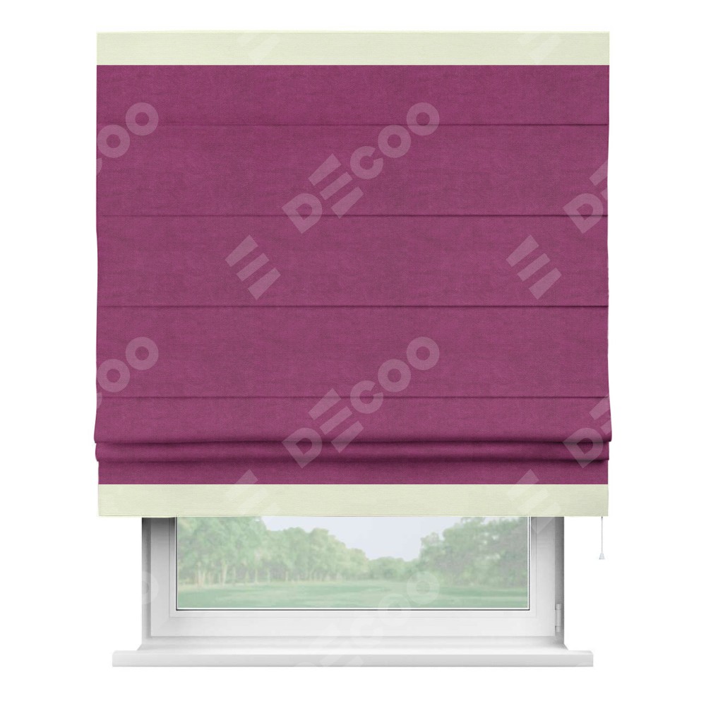 Римская штора производителя «Cortin», используется для проёма, пошита из ткани вельвет фиолетовый, артикул ткани 85552. Отделка шторы кантом «Горизонт», ткань для канта используется из вельвета разной расцветки на выбор. Имеет универсальный механизм и подходит для монтажа: на потолок, на стену и в нишу.