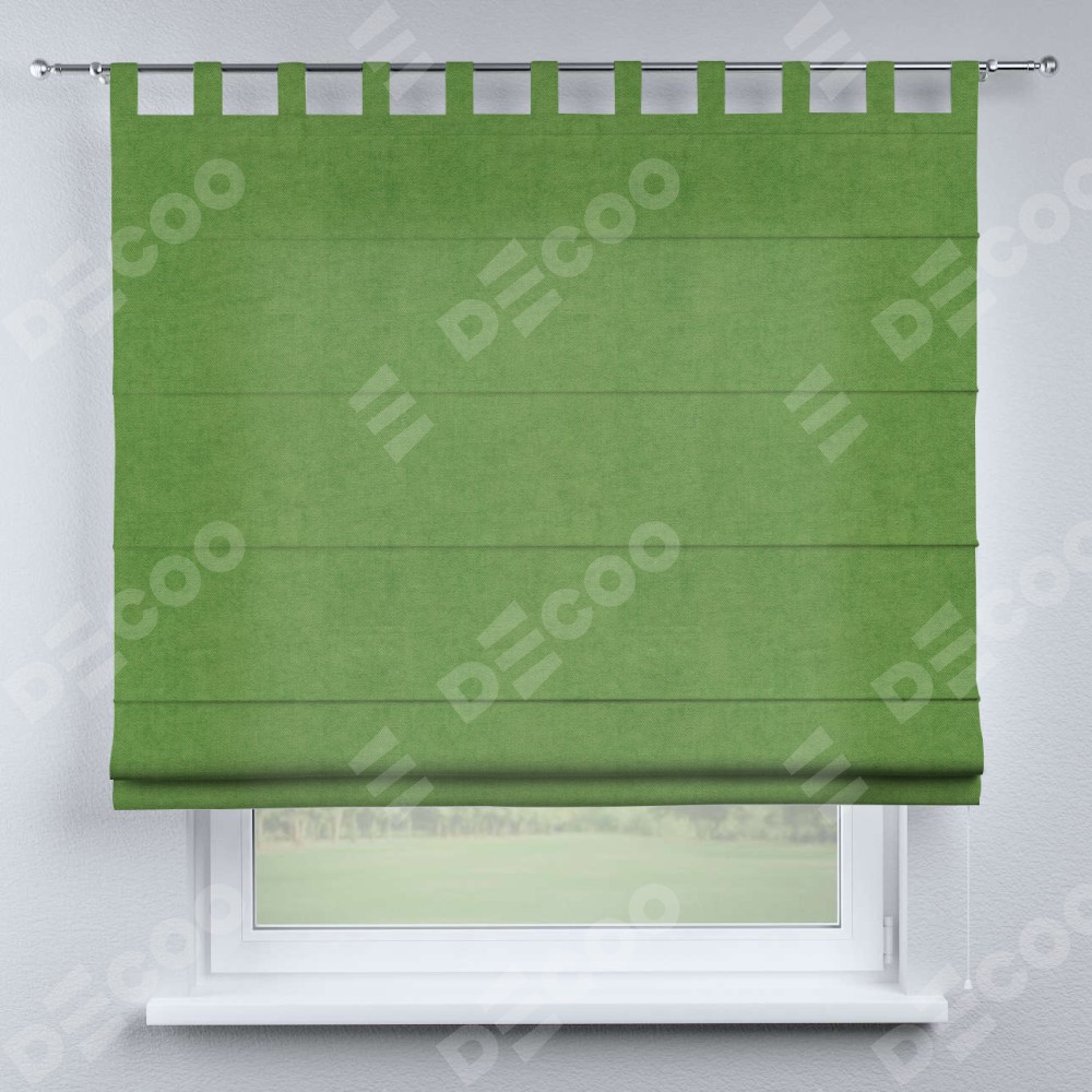 Римская штора производителя «Cortin», используется для проёма, пошита из ткани вельвет салатовый, артикул ткани 87072. Данная модель пошита на петлях, комплектуется на выбор круглым карнизом и подходит для монтажа на стену. Римская штора на петлях имеет простую систему регулировки высоты, отличительным преимуществом данной модели является простой способ монтажа. Достаточно повесить ее на трубу и штора готова!