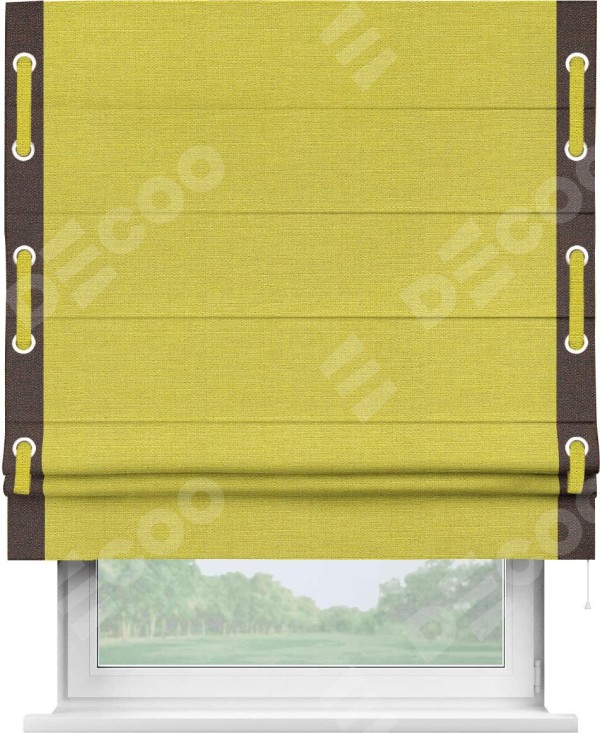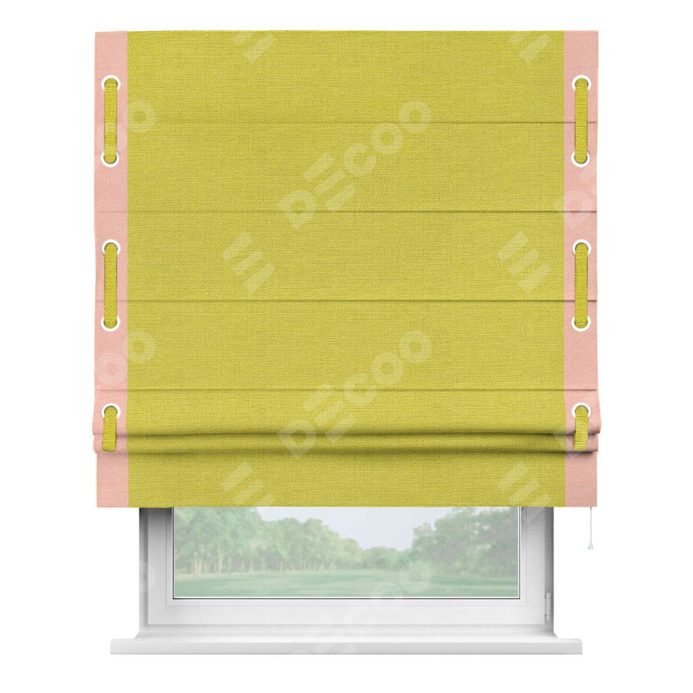 Римская штора производителя «Cortin», используется для проёма, пошита из ткани лён салатовый, артикул 53437. Отделка шторы кантом «Стрим Дуо» на кантах расположены люверсы с пояском, ткань для канта используется из льна разной расцветки на выбор. Ткань для пояска обычно используется из основной ткани шторы, а так же можно сделать из любой расцветки по желанию. Имеет универсальный механизм и подходит для монтажа: на потолок, на стену и в нишу.