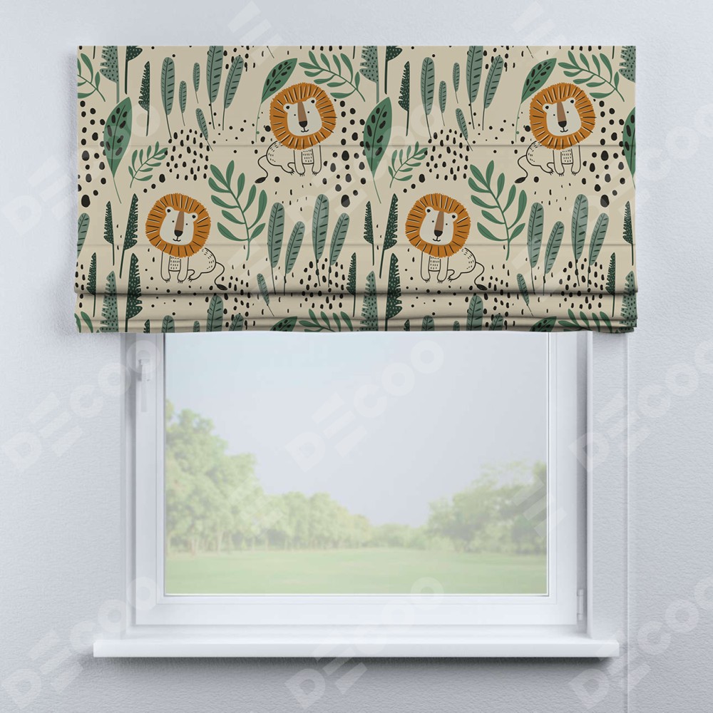 Римская штора производителя «Cortin», используется для проёма, пошита из ткани блэкаут с нанесением сублимационной печати «Лев из джунглей». Имеет универсальный механизм и подходит для монтажа: на потолок, на стену и в нишу.