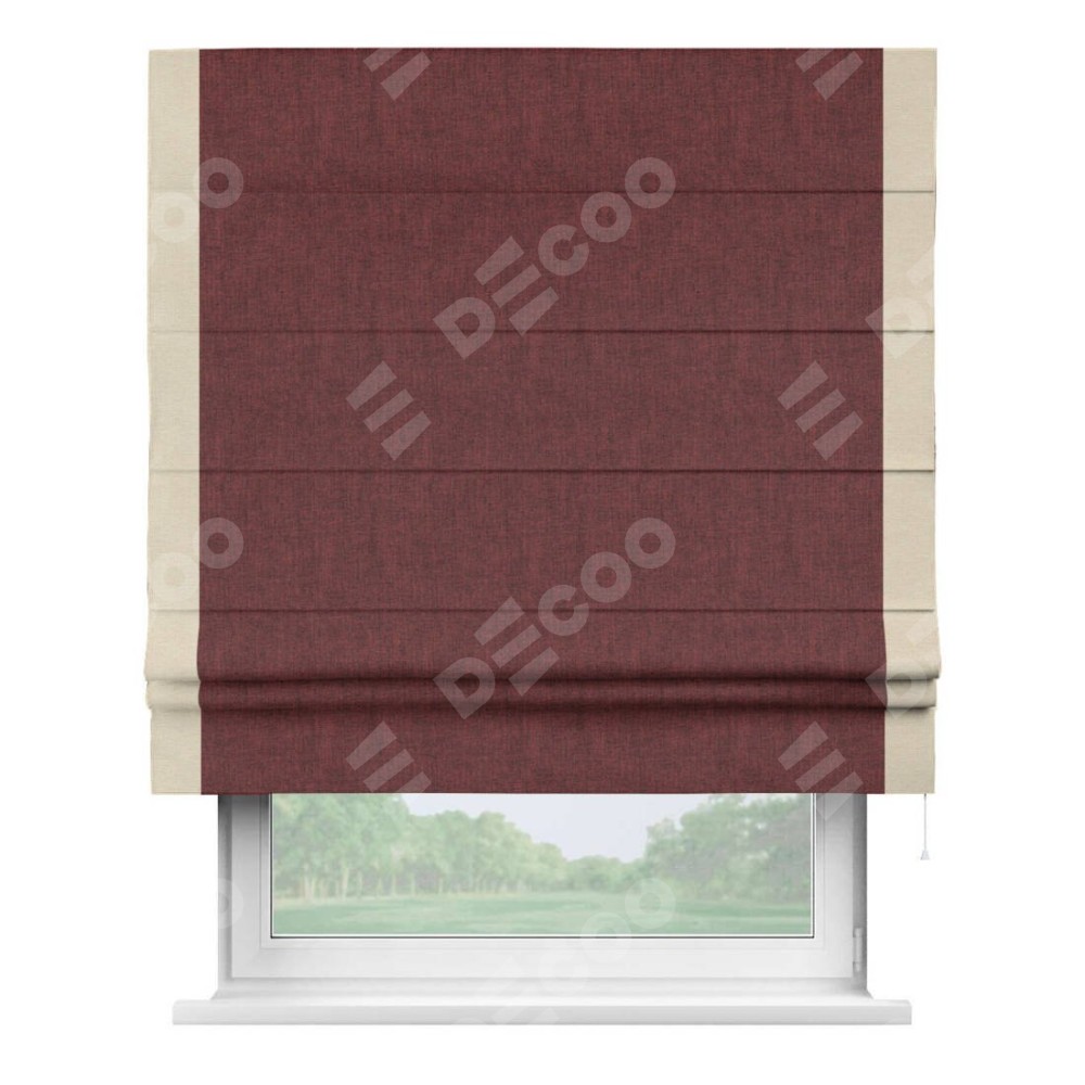 Римская штора производителя «Cortin», используется для проёма, пошита из ткани лён кашемир бордовый, артикул 17213. Отделка шторы кантом «Стрим Дуо», ткань для канта используется из льна разной расцветки на выбор. Имеет универсальный механизм и подходит для монтажа: на потолок, на стену и в нишу.