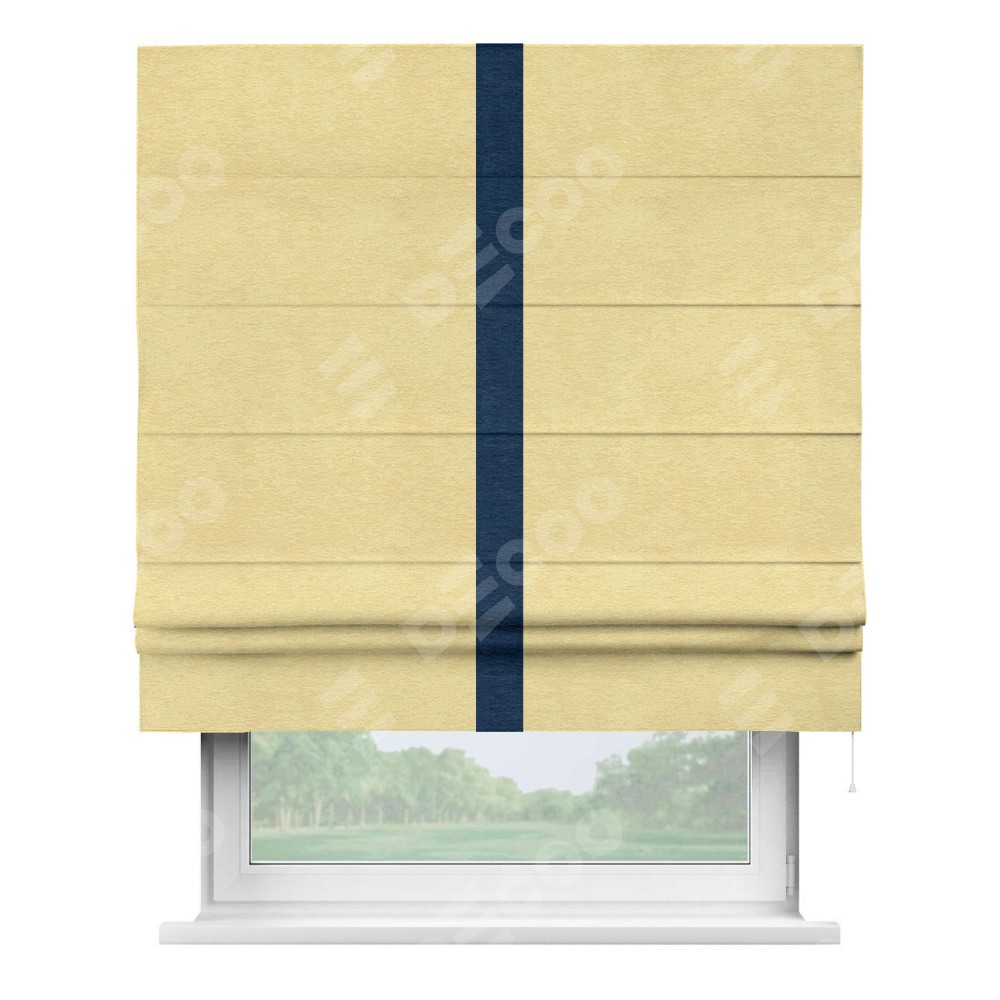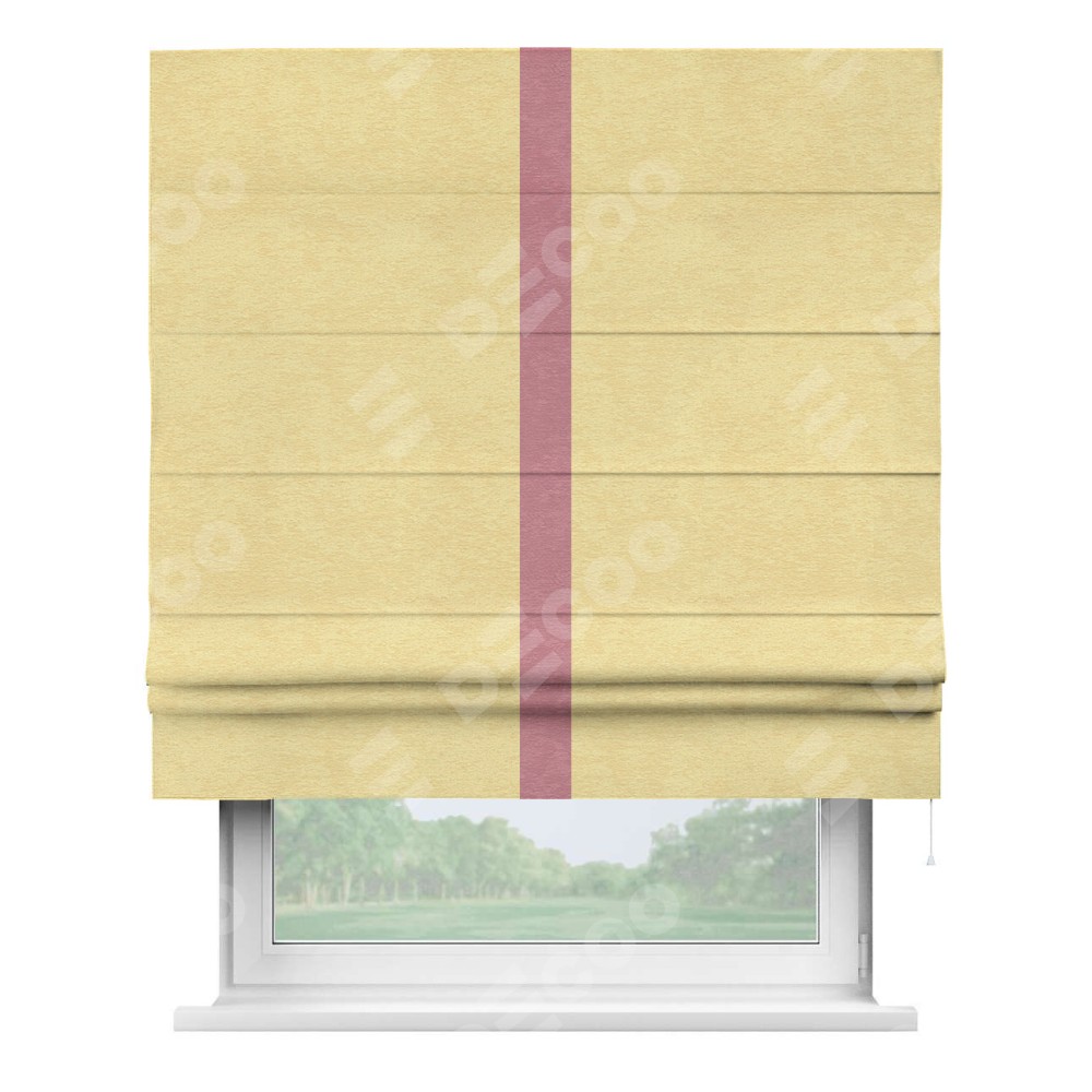 Римская штора производителя «Cortin», используется для проёма, пошита из ткани софт однотонный золотой, артикул 42934. Отделка шторы кантом «Хайвэй», ткань для канта используется из софта разной расцветки на выбор. Имеет универсальный механизм и подходит для монтажа: на потолок, на стену и в нишу.