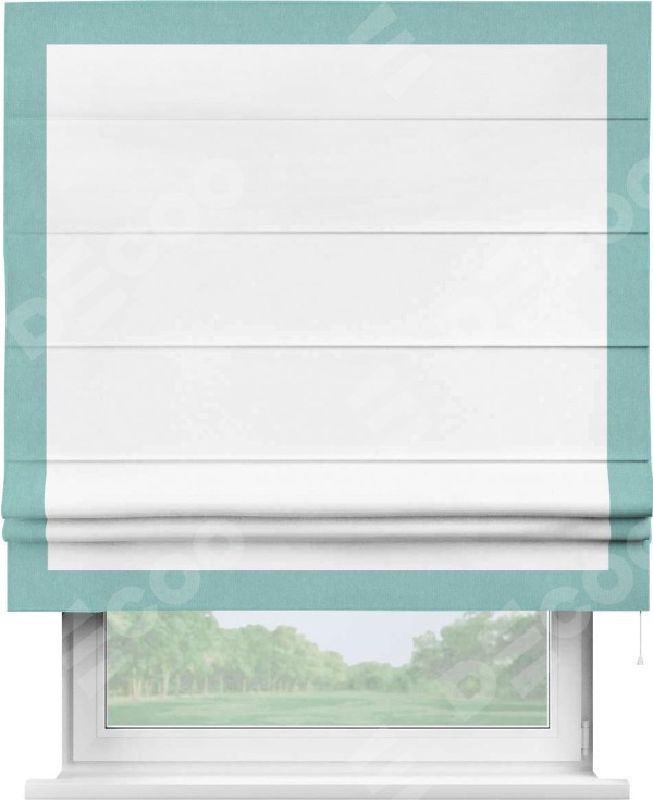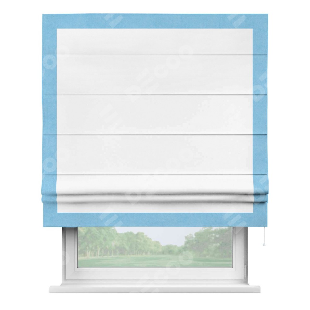 Римская штора производителя «Cortin», используется для проёма, пошита из ткани вельвет белоснежный, артикул ткани 19192. Отделка шторы кантом «Чесс», ткань для канта используется из вельвета разной расцветки на выбор. Имеет универсальный механизм и подходит для монтажа: на потолок, на стену и в нишу.