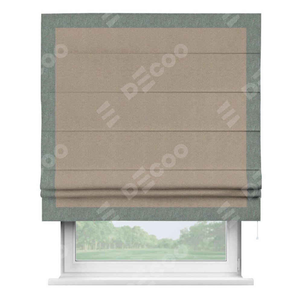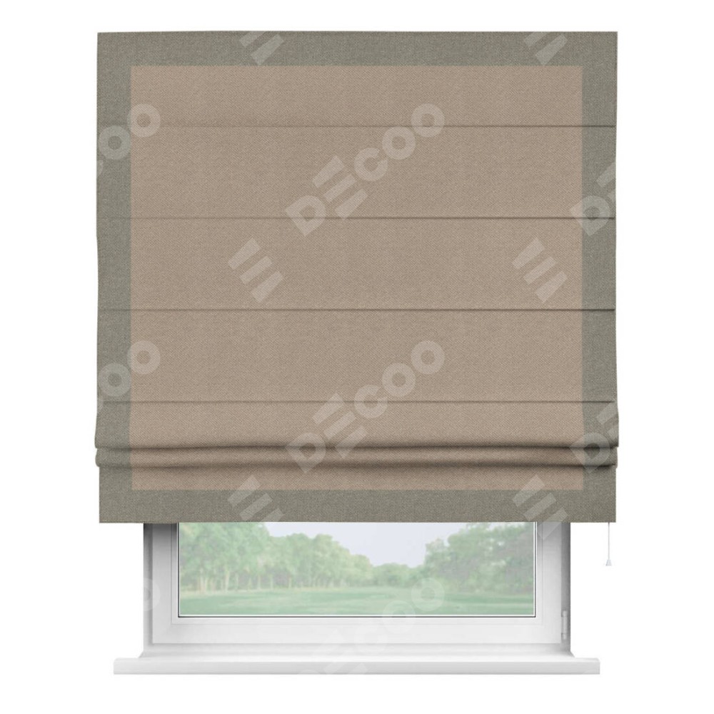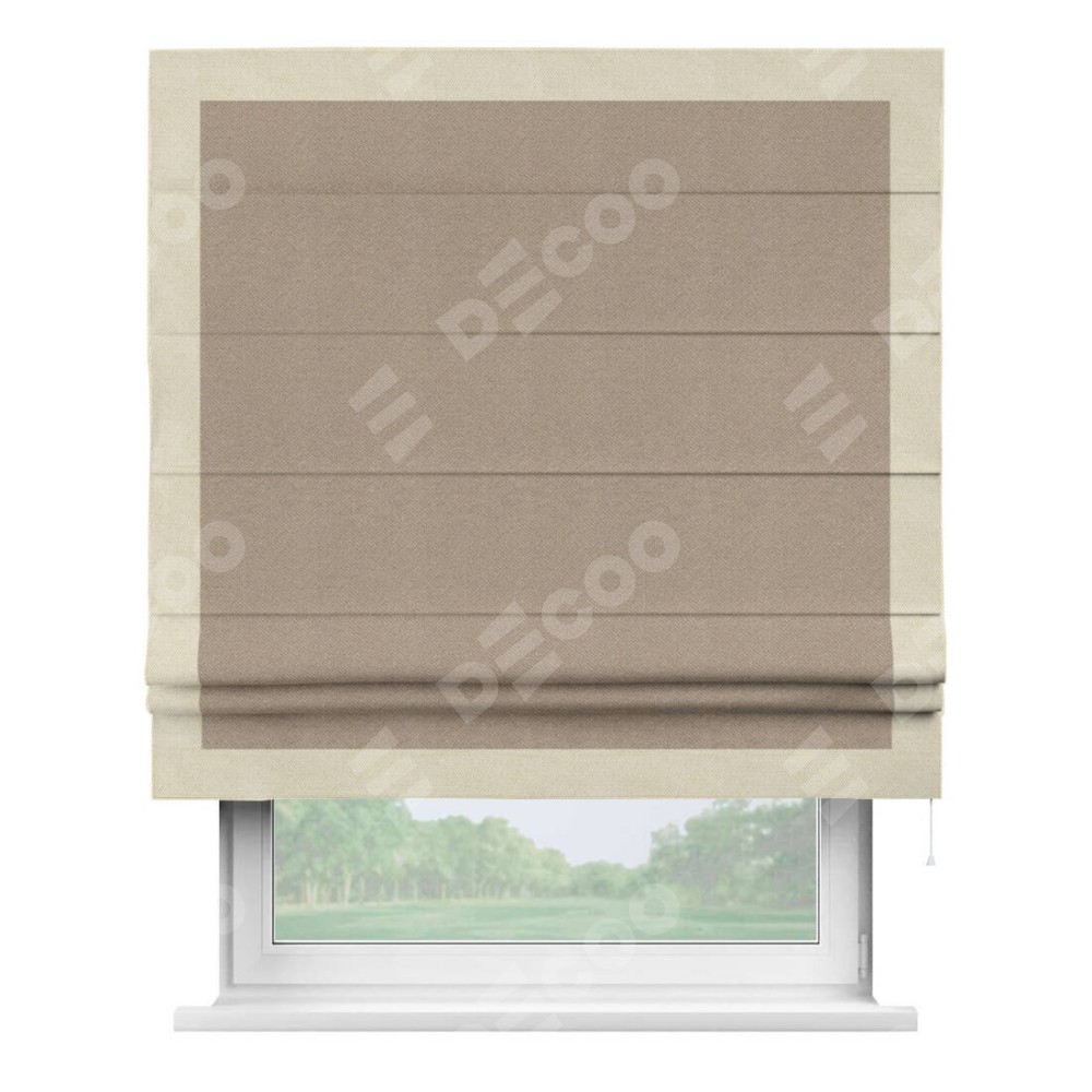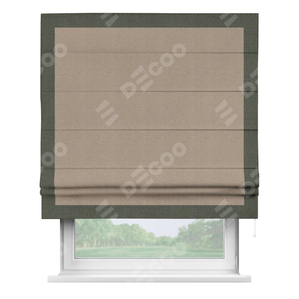 Римская штора производителя «Cortin», используется для проёма, пошита из ткани лён димаут светло-бежевый, артикул 00002. Отделка шторы кантом «Чесс», ткань для канта используется из льна димаут разной расцветки на выбор. Имеет универсальный механизм и подходит для монтажа: на потолок, на стену и в нишу.