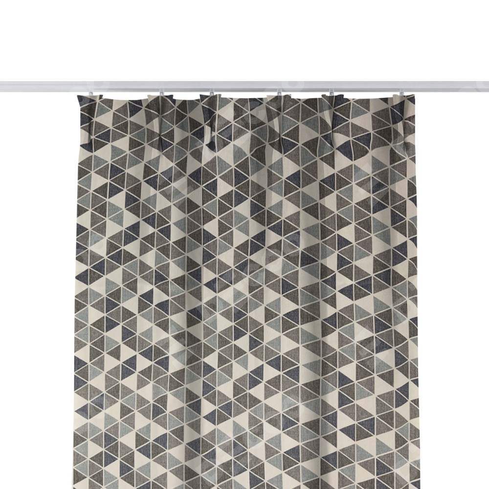 Комплект прямых штор, от производителя «Cortin», пошиты из ткани димаут «Треугольники синие», артикул ткани 23022. С изнаночной стороны в верхней части штор пристрачивается шторная лента с декоративными складками «Кустик». Для создания элегантных складок прямые шторы шьются по стандарту с коэффициентом 1:2 (на 100 см. ширины проёма 200 см. ширины ткани).