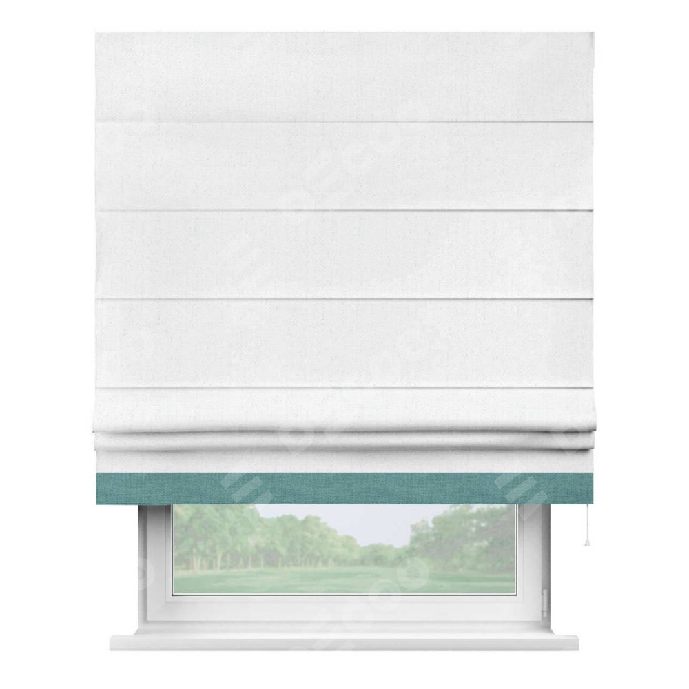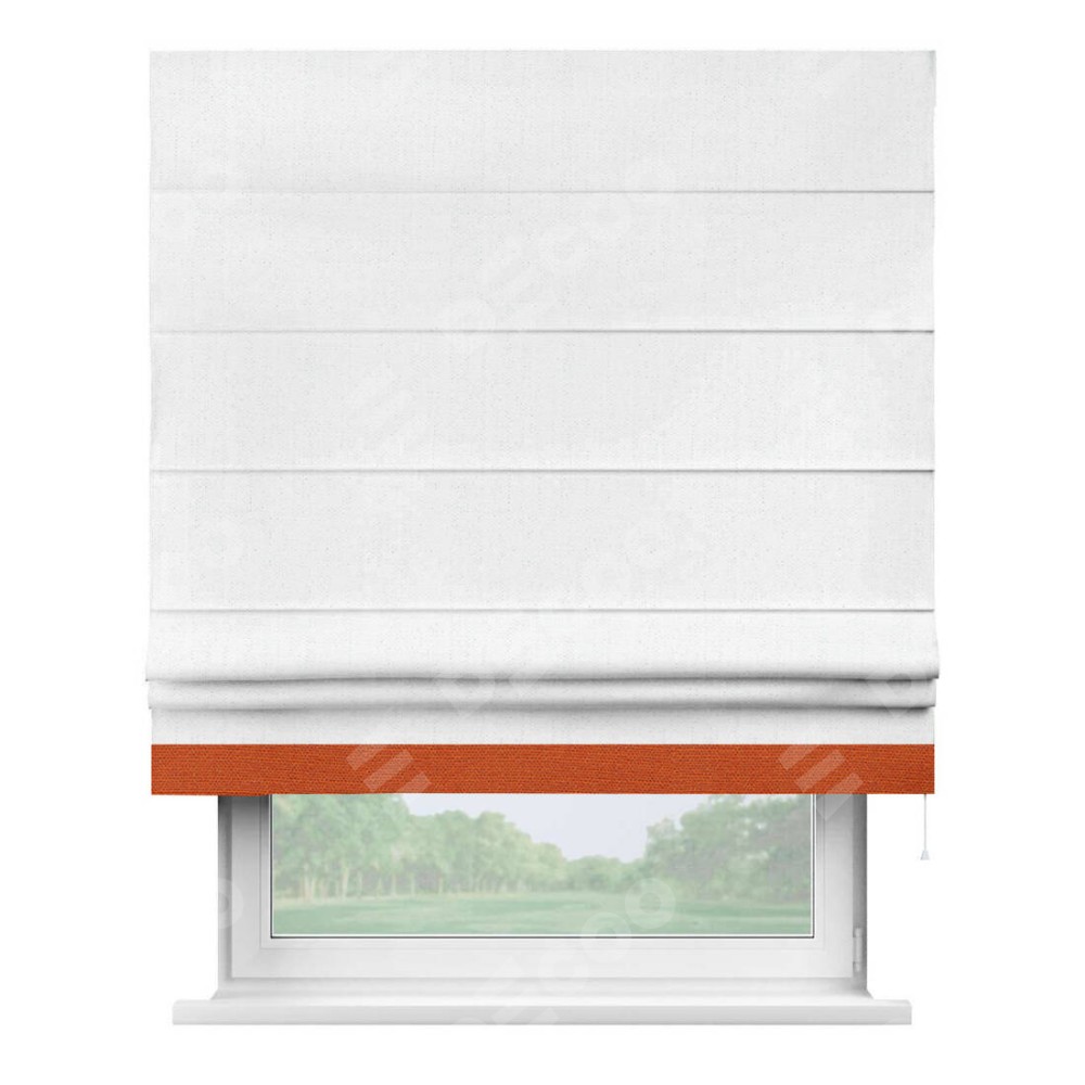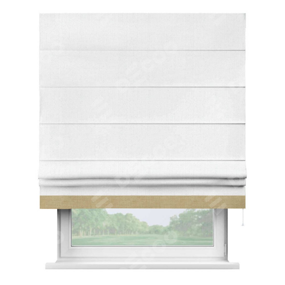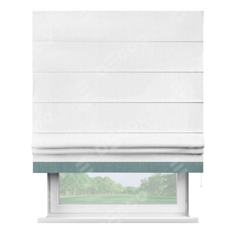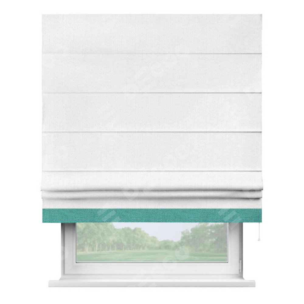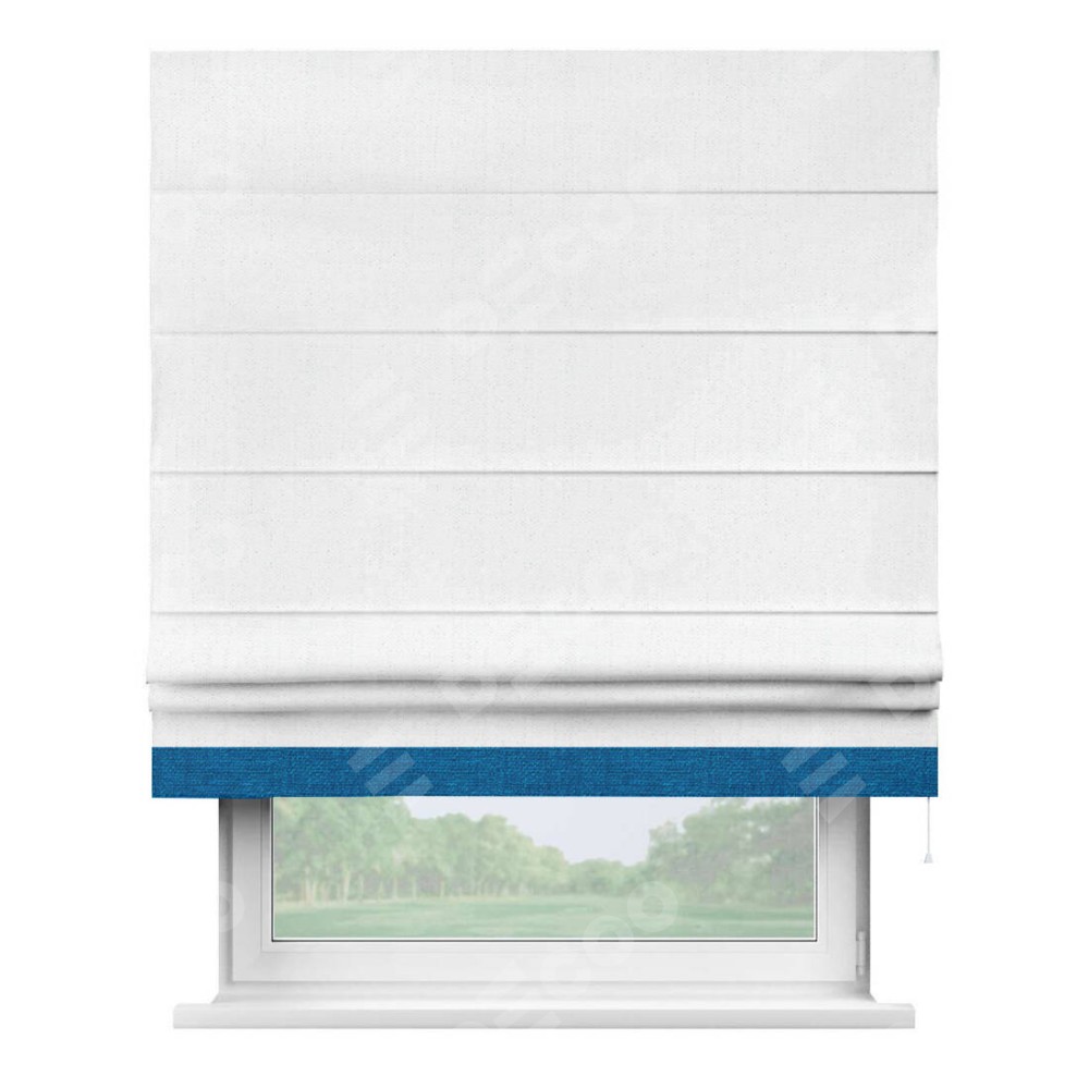 Римская штора производителя «Cortin», используется для проёма, пошита из ткани лён белоснежный, артикул 7438. Отделка шторы кантом «Джестер», ткань для канта используется из льна разной расцветки на выбор. Имеет универсальный механизм и подходит для монтажа: на потолок, на стену и в нишу.