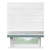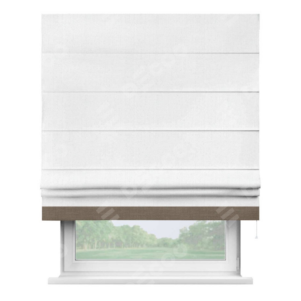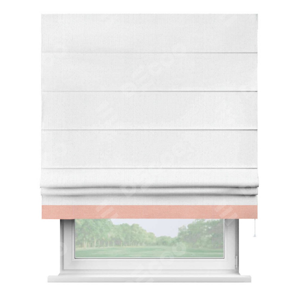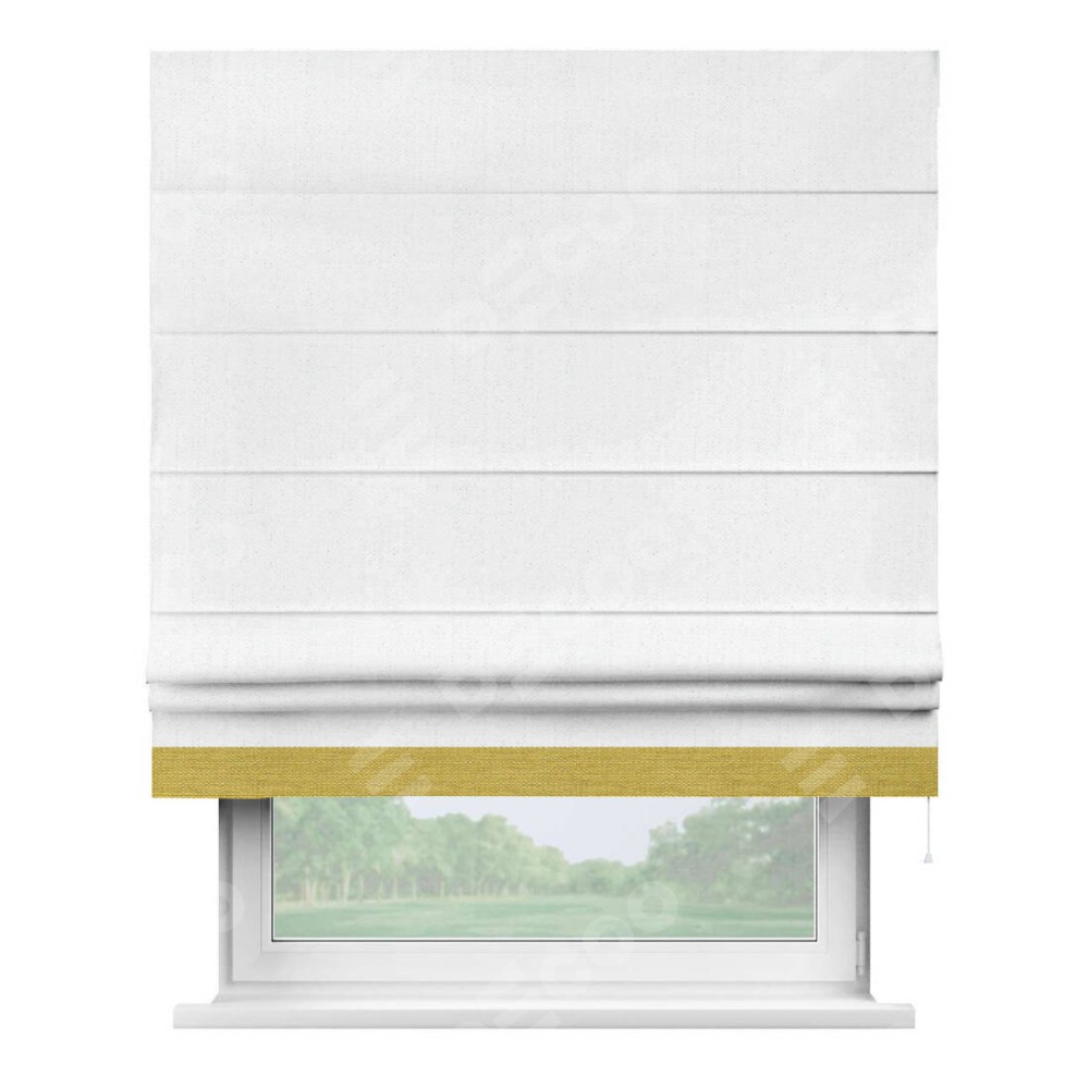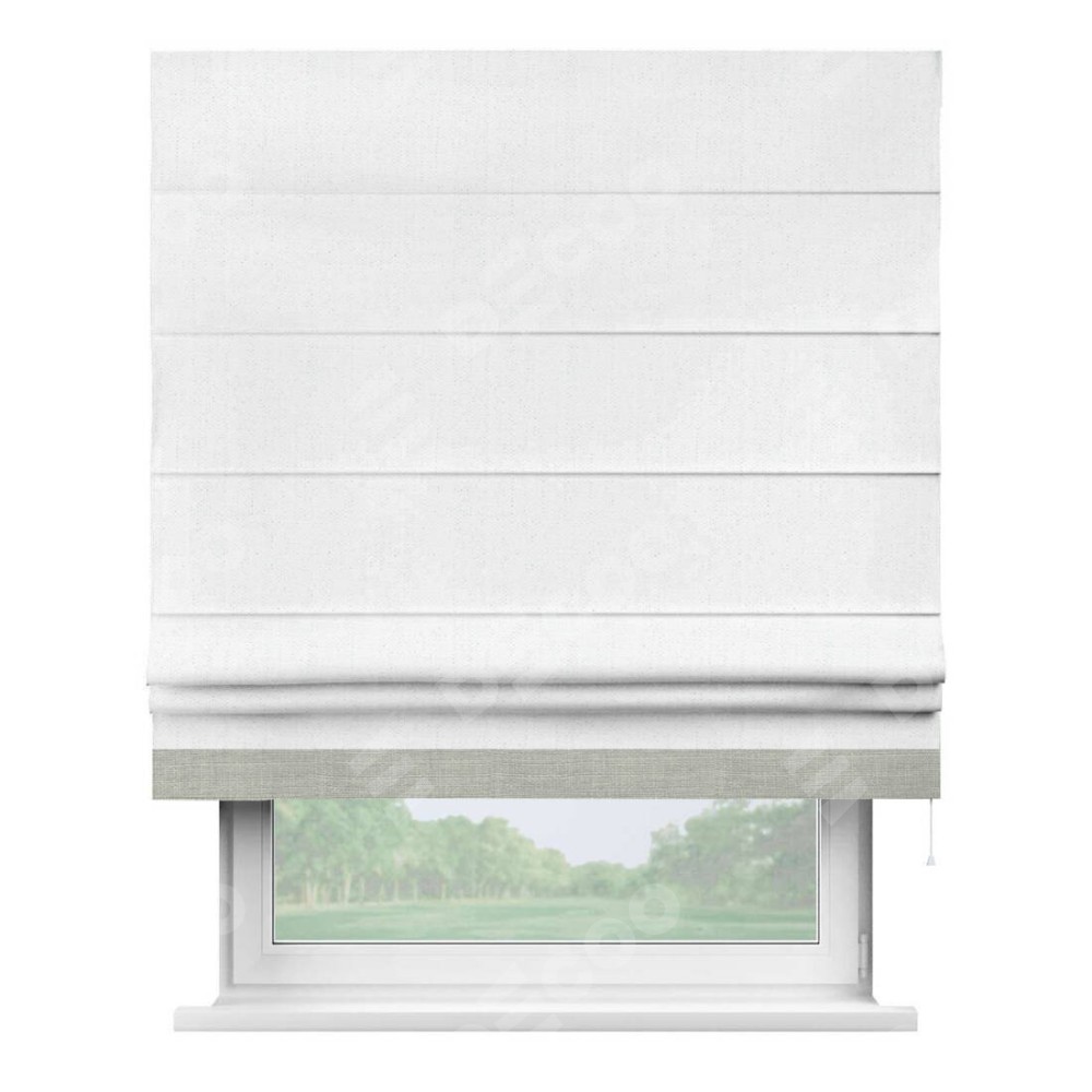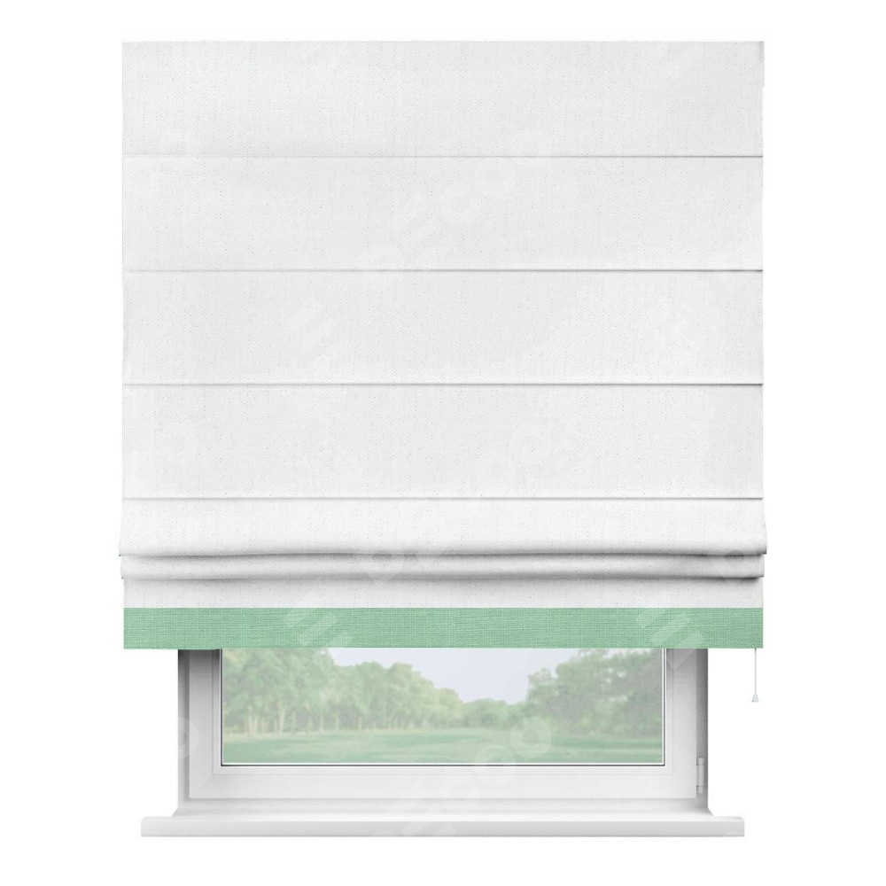 Римская штора производителя «Cortin», используется для проёма, пошита из ткани лён белоснежный, артикул 7438. Отделка шторы кантом «Джестер», ткань для канта используется из льна разной расцветки на выбор. Имеет универсальный механизм и подходит для монтажа: на потолок, на стену и в нишу.