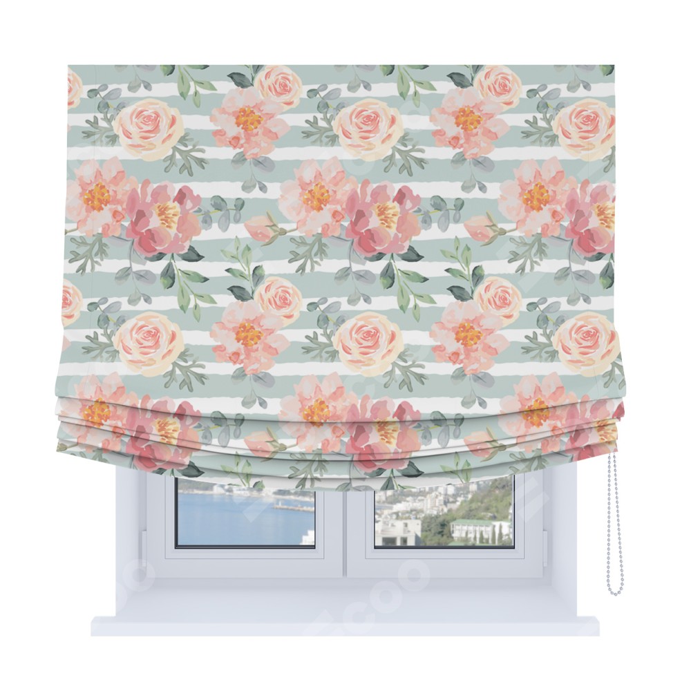 Римская штора Soft производителя «Cortin», используется для проёма, пошита из ткани блэкаут с нанесением сублимационной печати «Розы акварель». Имеет универсальный механизм и подходит для монтажа: на потолок, на стену и в нишу. В отличие от стандартных римских штор, римская штора Soft не имеет горизонтальных вставок и нижнего отвеса. Это позволяет ткани произвольно драпироваться в свободные мягкие складки.