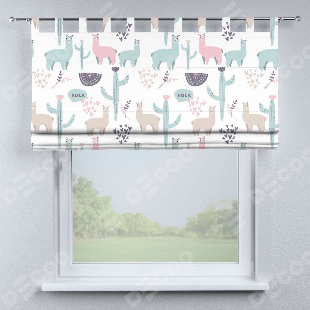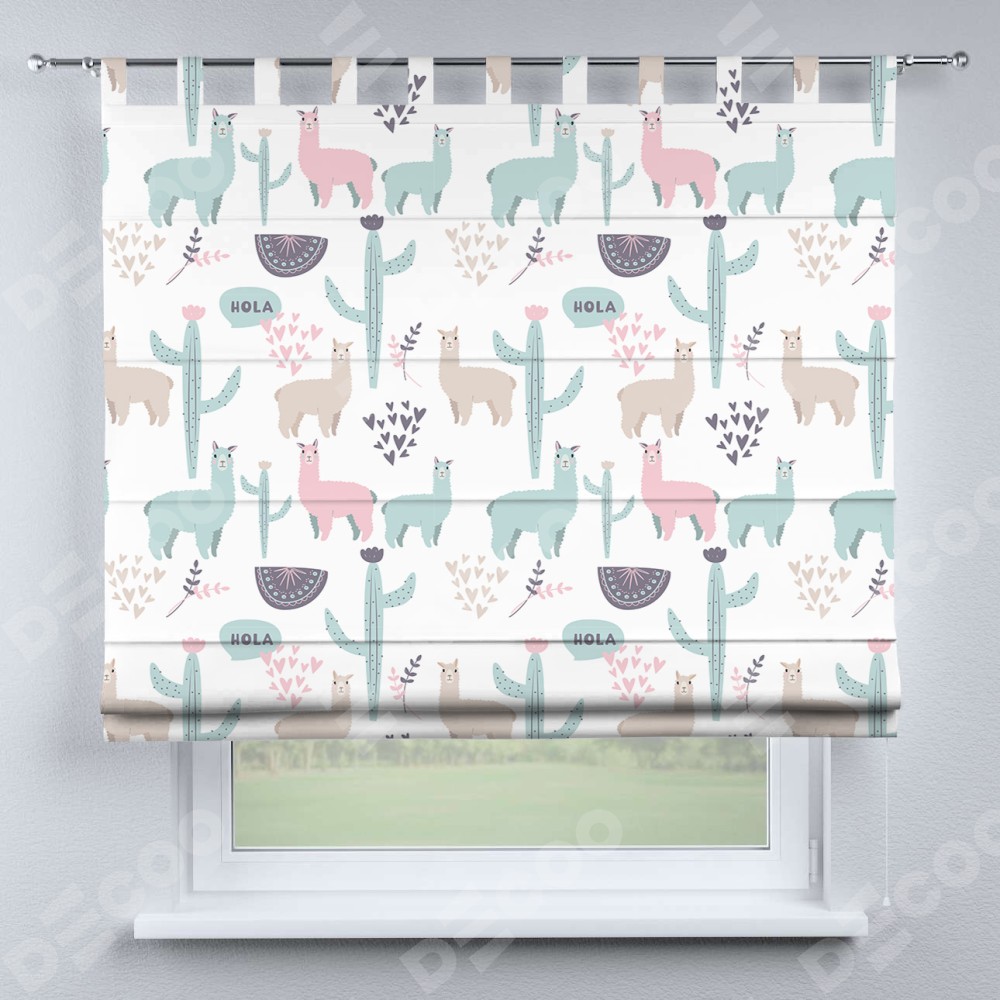 Римская штора производителя «Cortin», используется для проёма, пошита из ткани блэкаут с нанесением сублимационной печати «Милый лама». Данная модель пошита на петлях, комплектуется на выбор круглым карнизом и подходит для монтажа на стену. Римская штора на петлях имеет простую систему регулировки высоты, отличительным преимуществом данной модели является простой способ монтажа. Достаточно повесить ее на трубу и штора готова!