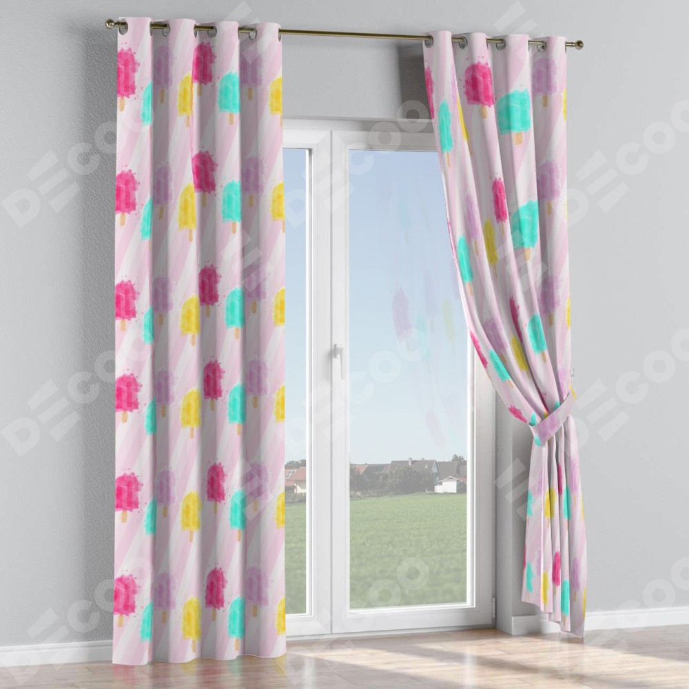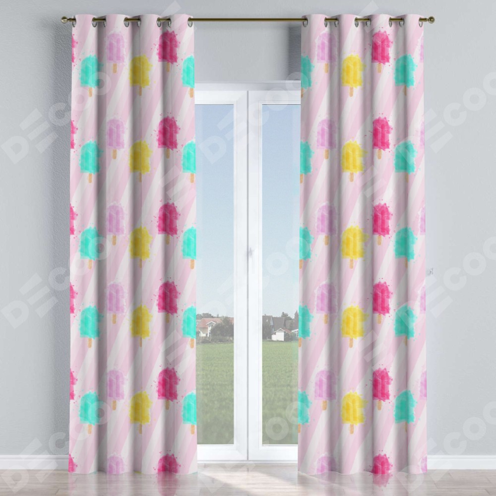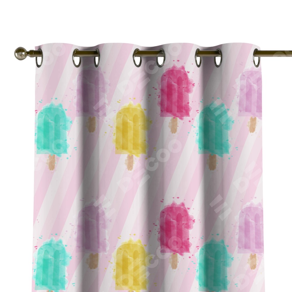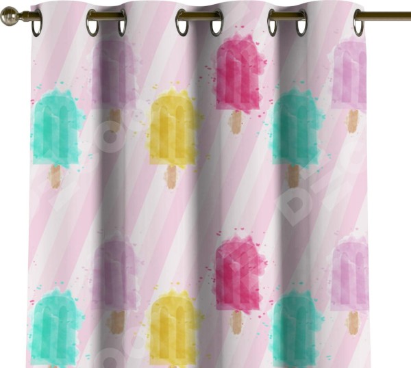 Комплект прямых штор, от производителя «Cortin», пошиты из ткани блэкаут с нанесением сублимационной печати «Фруктовое мороженое». Данная модель пошита на люверсах, комплектуется на выбор круглым карнизом и подходит для монтажа на стену или потолок. Прямые шторы на люверсах шьются по стандарту с коэффициентом 1/2 (на 100 см. ширины проёма 200 см. ширины ткани), отличительным преимуществом данной модели является простой способ монтажа. Достаточно повесить ее на трубу и штора готова!