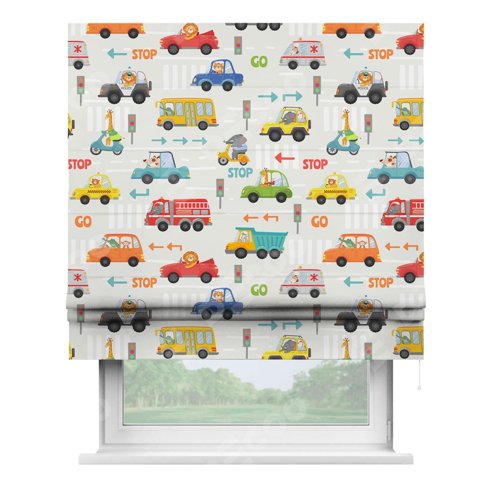 Римская штора производителя «Cortin», используется для проёма, пошита из ткани блэкаут с нанесением сублимационной печати «Дорожные правила». Имеет универсальный механизм и подходит для монтажа: на потолок, на стену и в нишу.