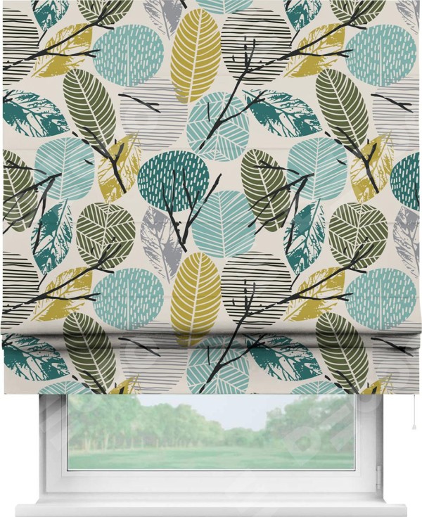 Римская штора производителя «Cortin», используется для проёма, пошита из ткани блэкаут с нанесением сублимационной печати «Ботанический сад». Имеет универсальный механизм и подходит для монтажа: на потолок, на стену и в нишу.