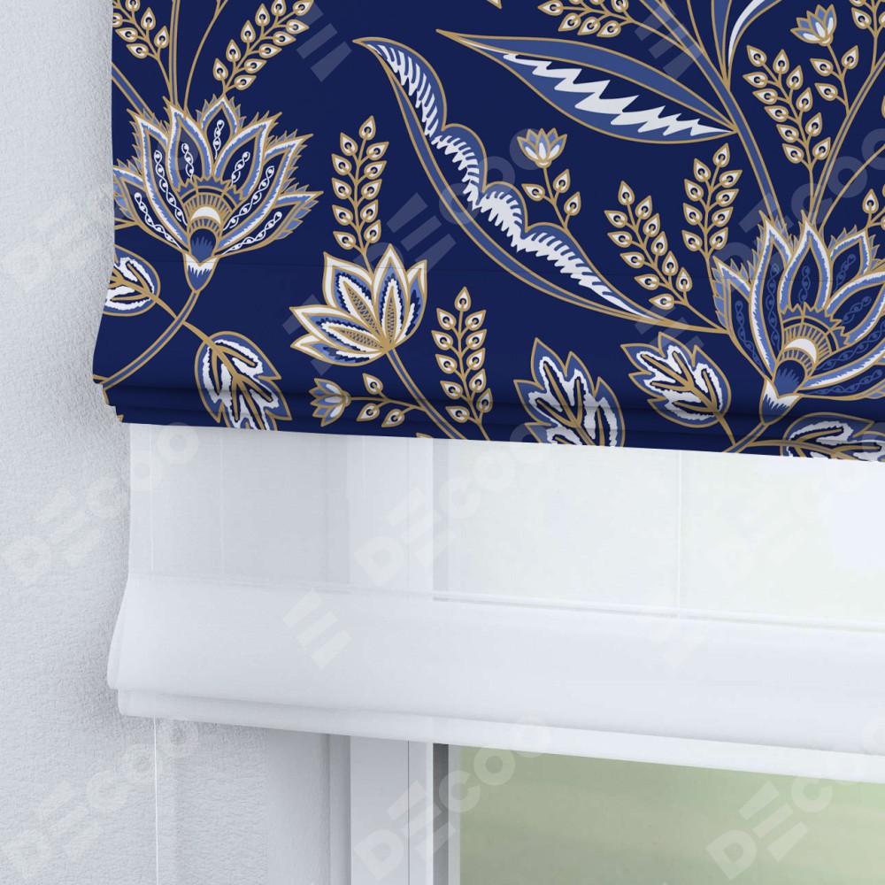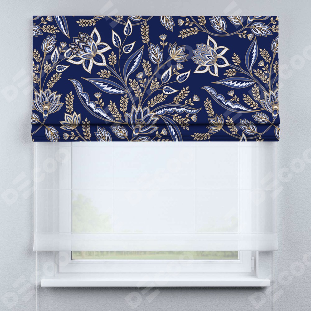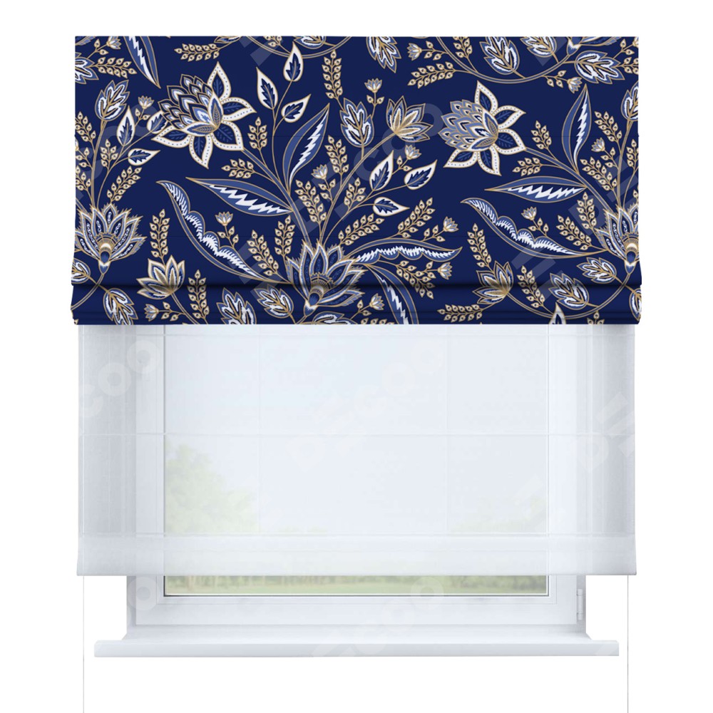 Римская штора день-ночь производителя «Cortin», используется для проёма, пошита из двух полотен, с лицевой блэкаут с нанесением сублимационной печати «Индиго батик», вторая ткань тюль (по стандарту комплектуется тюль белого цвета артикул V-01). Имеет универсальный механизм и подходит для монтажа: на потолок, на стену и в нишу.