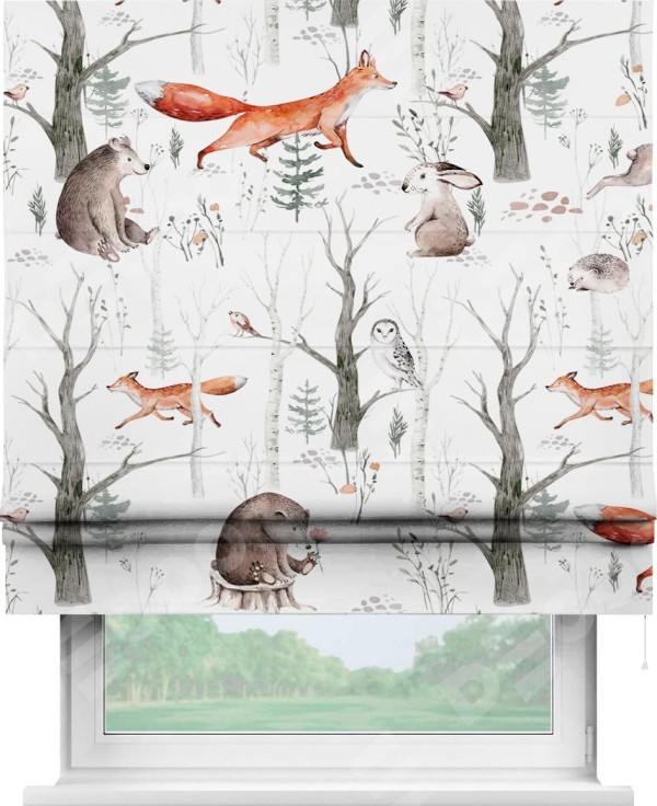 Римская штора производителя «Cortin», используется для проёма, пошита из ткани блэкаут с нанесением сублимационной печати «Лесной питомник». Имеет универсальный механизм и подходит для монтажа: на потолок, на стену и в нишу.
